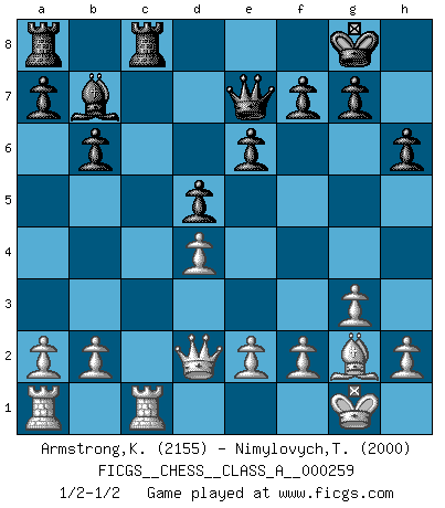 Last move : 1/2-1/2 2022 July 31 10:47:44 [Event "FICGS__CHESS__CLASS_A__000259"] [Site "FICGS"] [Date "2022.06.21"] [Round "1"] [White "Armstrong,Keith"] [Black "Nimylovych,Taras"] [Result "1/2-1/2"] [WhiteElo "2155"] [BlackElo "2000"] 1.d4 Nf6 2.Nf3 e6 3.c4 d5 4.g3 Bb4+ 5.Bd2 Be7 6.Bg2 O-O 7.O-O Nbd7 8.Qc2 c6 9.Bf4 b6 10.Rd1 Bb7 11.Ne5 Nh5 12.Bd2 Nhf6 13.cxd5 cxd5 14.Nc6 Qe8 15.Nxe7+ Qxe7 16.Nc3 Rfc8 17.Rdc1 Ne4 18.Be1 Nxc3 19.Bxc3 Nf6 20.Qd3 Ne4 21.Bd2 Nxd2 22.Qxd2 h6 1/2-1/2 Queen's pawn game Kingside Castling by player Black (move 6) Kingside Castling by player White (move 7) This chess game ended in a draw. Follow this game move after move (download)When in doubt... play Chess ! (Tevis) Schach wird sich dank seiner hohen kulturellen Tradition immer durchsetzen. In näherer Zukunft womöglich sogar als Gegenreaktion auf die maßlose Reizüberflutung im Freizeit- und Spielbereich. (Garry Kasparov) Muchos se han convertido en Maestros de Ajedrez, nadie se ha convertido en el Maestro del Ajedrez. (Siegbert Tarrasch) Les échecs sont plus proches de l'art de l'assassinat que de l'art de la guerre. (Arturo Perez-Reverte) I live to kill Traxler counterattack. (Ilmars Cirulis)