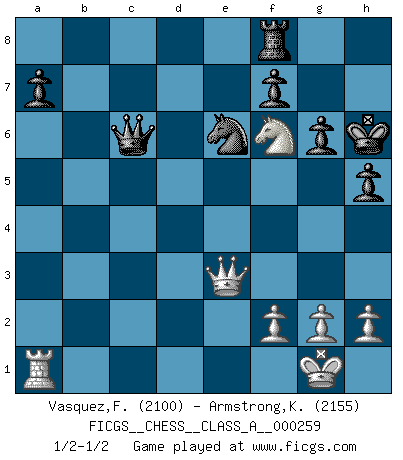 Last move : 1/2-1/2 2022 December 8 9:17:17 [Event "FICGS__CHESS__CLASS_A__000259"] [Site "FICGS"] [Date "2022.06.21"] [Round "1"] [White "Vasquez,Fernando"] [Black "Armstrong,Keith"] [Result "1/2-1/2"] [WhiteElo "2100"] [BlackElo "2155"] 1.e4 c5 2.c3 Nf6 3.e5 Nd5 4.d4 cxd4 5.cxd4 d6 6.Nf3 Nc6 7.Bc4 Nb6 8.Bb5 Bd7 9.Nc3 dxe5 10.dxe5 g6 11.O-O Bg7 12.Qe2 O-O 13.Rd1 Qc7 14.a4 Nxe5 15.Bxd7 Nxf3+ 16.Qxf3 Nxd7 17.Nd5 Qe5 18.Bf4 Qxb2 19.Rab1 Qa2 20.Rxb7 Nc5 21.Rb5 Ne6 22.Nxe7+ Kh8 23.Be5 Qxa4 24.Bxg7+ Kxg7 25.Nd5 h5 26.Qc3+ Kh7 27.Nf6+ Kh6 28.Rbd5 Rac8 29.Qd2+ Qf4 30.Qb2 Rc5 31.Rxc5 Nxc5 32.Nd5 Qa4 33.Ra1 Qc6 34.Qd2+ Kh7 35.Qd4 Ne6 36.Nf6+ Kg7 37.Qe5 Kh6 38.Qe3+ Kg7 39.Qe5 Kh6 40.Qe3+ 1/2-1/2 Sicilian : Alapin's variation (2.c3) Kingside Castling by player White (move 11) Kingside Castling by player Black (move 12) This chess game ended in a draw. Follow this game move after move (download)It is difficult to play against Einstein's theory --on his first loss to Fischer. (Mikhail Tal) Der Schachmeister von Heute braucht Courage, einen Killerinstinkt, Ausdauer und Arroganz. (Larry Evans) El Ajedrez es un terrible juego. Si no controlas el centro, tu oponente tiene una posición mas holgada. Si tienes control del centro, ¡entonces realmente tu tienes algo de que preocuparte!. (Siegbert Tarrasch) Ce n'est pas pour s'amuser qu'il joue aux échecs : il célèbre un culte. (Vladimir Nabokov) Horse racing is animated roulette. (Roger Kahn)