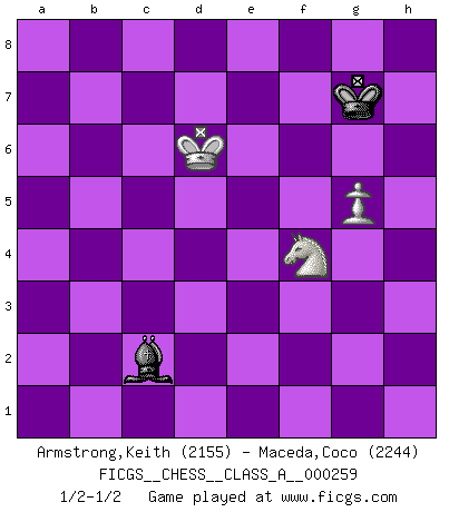 Last move : 1/2-1/2 2022 October 16 19:6:52 [Event "FICGS__CHESS__CLASS_A__000259"] [Site "FICGS"] [Date "2022.06.21"] [Round "1"] [White "Armstrong,Keith"] [Black "Maceda,Coco"] [Result "1/2-1/2"] [WhiteElo "2155"] [BlackElo "2244"] 1.d4 d5 2.c4 e6 3.Nc3 c6 4.e4 dxe4 5.Nxe4 Bb4+ 6.Bd2 Qxd4 7.Bxb4 Qxe4+ 8.Be2 Na6 9.Ba5 b6 10.Qd6 Bd7 11.Bc3 f6 12.Nf3 Nh6 13.Rd1 Rd8 14.Qa3 Bc8 15.Nd2 Qf4 16.Bh5+ Nf7 17.O-O c5 18.Qa4+ Ke7 19.Rfe1 Rhe8 20.Re3 Kf8 21.h3 Re7 22.Ne4 Rxd1+ 23.Qxd1 Rd7 24.Qa4 Nb8 25.b4 Bb7 26.Nd2 Qd6 27.Be2 e5 28.Nb3 Qc6 29.Qxc6 Nxc6 30.bxc5 Ba6 31.cxb6 axb6 32.Bf3 Bb7 33.Re1 Nfd8 34.Bg4 Rc7 35.Bd2 Bc8 36.Bf3 Ra7 37.Ra1 Be6 38.Be3 Ra6 39.Be2 Nb4 40.Nc5 Rxa2 41.Rxa2 Nxa2 42.Na4 Nc6 43.f4 Nd4 44.Bd3 Nb4 45.Bxh7 Ne2+ 46.Kf2 Nxf4 47.Bxf4 exf4 48.Nxb6 g5 49.h4 f5 50.hxg5 Kg7 51.g6 Nd3+ 52.Ke2 Ne5 53.Nd5 Nxc4 54.Nxf4 Bd7 55.Kd3 Ne5+ 56.Kd4 Ng4 57.Nd5 Be6 58.Nc7 Ba2 59.Ne8+ Kh8 60.g3 Bb3 61.Nd6 Be6 62.Nf7+ Kg7 63.Ng5 Bb3 64.Nf3 Nf6 65.Ke5 Nxh7 66.gxh7 Kxh7 67.Nd4 Bc4 68.Kxf5 Bf1 69.Kg4 Kh6 70.Kh4 Bc4 71.g4 Kg6 72.g5 Bd3 73.Kg4 Kg7 74.Ne6+ Kh7 75.Nf4 Bc2 76.Kf3 Bb1 77.Ke3 Kg7 78.Kd4 Bf5 79.Ke5 Bc2 80.Kd6 1/2-1/2 QGD : Semi-Slav, Marshall gambit Kingside Castling by player White (move 17) 10 pieces endgame at move 53 : White KBNPP , Black KBNPP WHITE : King + 1 Bishop 1 Knight 2 Pawns BLACK : King + 1 Bishop 1 Knight 2 Pawns 9 pieces endgame at move 54 : White KBNPP , Black KBNP WHITE : King + 1 Bishop 1 Knight 2 Pawns BLACK : King + 1 Bishop 1 Knight 1 Pawn 8 pieces endgame at move 65 : White KNPP , Black KBNP WHITE : King + 1 Knight 2 Pawns BLACK : King + 1 Bishop 1 Knight 1 Pawn 7 pieces endgame at move 66 : White KNPP , Black KBP WHITE : King + 1 Knight 2 Pawns BLACK : King + 1 Bishop 1 Pawn 6 pieces endgame at move 66 : White KNP , Black KBP WHITE : King + 1 Knight 1 Pawn BLACK : King + 1 Bishop 1 Pawn 5 pieces endgame at move 68 : White KNP , Black KB WHITE : King + 1 Knight 1 Pawn BLACK : King + 1 Bishop This chess game ended in a draw. Follow this game move after move (download)A man that will take back a move at Chess will pick a pocket. (Richard Fenton) Schach ist eine Sache der genauen Beurteilung, wann man zuschlagen und wann man sich ducken muss. (Robert James Fischer) Una partida de Ajedrez se divide en 3 etapas: la primera cuando piensas que tienes la ventaja, la segunda cuando crees que tienes la ventaja y la tercera... ¡cuando te das cuenta que vas a perder!. (Savielly Tartakower) Les échecs sont un jeu terrible. Si vous n'avez pas le centre, votre adversaire a une position plus libre. Par contre, si vous avez le centre, alors vous avez vraiment quelque chose pour laquelle vous inquiéter ! (Siegbert Tarrasch) The only thing that matters is the evidence. (Horatio Caine, C.S.I. Miami)