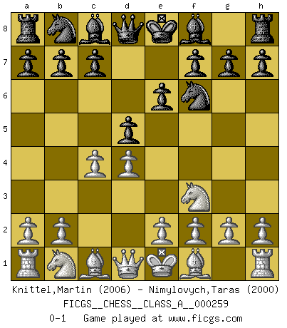 Last move : 0-1 2022 August 4 23:56:15 [Event "FICGS__CHESS__CLASS_A__000259"] [Site "FICGS"] [Date "2022.06.21"] [Round "1"] [White "Knittel,Martin"] [Black "Nimylovych,Taras"] [Result "0-1"] [WhiteElo "2006"] [BlackElo "2000"] 1.Nf3 d5 2.d4 e6 3.c4 Nf6 0-1 This chess game has been lost on time (started : 2022.06.21 4:27:45) Reti Opening Player Black won this chess game. Follow this game move after move (download)Chess is life. (Bobby Fischer) Glücklicherweise sind Großmeister Ruben Fines reine Schachbücher weniger phallozentrisch [als seine Schachpsychologie] und deswegen auch weniger lächerlich. (Nigel Short) El Ajedrez era la lengua materna de Capablanca. (Reti) Shah mat. Le roi est mort. Cri de fierté d'un joueur venant de terrasser son adversaire, courtoisement, sans effusion de sang. I find television to be very educating. Every time somebody turns on the set, I go in the other room and read a book. (Groucho Marx)