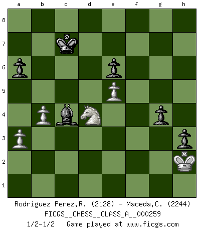 Last move : 1/2-1/2 2022 December 26 4:53:50 [Event "FICGS__CHESS__CLASS_A__000259"] [Site "FICGS"] [Date "2022.06.21"] [Round "1"] [White "Rodriguez Perez,Rene"] [Black "Maceda,Coco"] [Result "1/2-1/2"] [WhiteElo "2128"] [BlackElo "2244"] 1.e4 c5 2.Nf3 d6 3.d4 cxd4 4.Qxd4 Nc6 5.Bb5 Bd7 6.Bxc6 Bxc6 7.Nc3 Nf6 8.Bg5 e6 9.Bxf6 Qxf6 10.Qe3 Qd8 11.Nd4 Be7 12.O-O-O O-O 13.Kb1 Qd7 14.Qd3 a6 15.f4 Rac8 16.g4 b5 17.h4 Ba8 18.g5 b4 19.Nce2 f5 20.gxf6 Bxf6 21.h5 Qe7 22.Rhg1 h6 23.Rg6 Kh8 24.Ng3 Bb7 25.Re1 Rc5 26.Nb3 Rc7 27.Nd4 Bc8 28.e5 dxe5 29.fxe5 Bh4 30.Rg1 Qc5 31.Rg4 Bd8 32.Re1 Rcf7 33.Nb3 Qa7 34.Ne4 Bb7 35.Nd4 Bd5 36.b3 Bb6 37.Nd6 Rf4 38.Rxf4 Rxf4 39.Ne2 Rf8 40.Nc1 Bf2 41.Rf1 Bg2 42.Rd1 Bf3 43.Rf1 Bxh5 44.Qe4 Qe7 45.Nd3 Bg3 46.Rxf8+ Qxf8 47.Qxb4 Qf3 48.Ne4 Bg6 49.Nxg3 Qxg3 50.Qf4 Qxf4 51.Nxf4 Bf5 52.Kc1 g5 53.Ne2 h5 54.Kd2 h4 55.c4 Be4 56.Ke3 Bb7 57.Kf2 Kg7 58.Nd4 Kf7 59.c5 Be4 60.c6 g4 61.c7 Bb7 62.Ne2 Ke8 63.Ke3 Kd7 64.Kf4 h3 65.Kg3 Bc6 66.Nd4 Bd5 67.a3 Kxc7 68.b4 Bc4 69.Kh2 1/2-1/2 Sicilian, Chekhover variation Queenside Castling by player White (move 12) Kingside Castling by player Black (move 12) This chess game ended in a draw. Follow this game move after move (download)You cannot play at Chess if you are kind-hearted. (French Proverb) Korrekt heißt in Deutschland die Haltung eines Mannes, dessen Benehmen nach dem Urteile seiner Nachbarn seiner Stellung angemessen ist. Um korrekt zu sein, muß man sich der Meinung der anderen anpassen... (Emanuel Lasker) El juego de Fischer siempre fue nítido, racional y brillante. Uno de los mejores por siempre. (Dave Regis) Que feriez-vous si vous étiez en train de jouer aux échecs et que la fin du monde arrive ? Je continuerais à jouer. (Saint Borromée) Follow your passion, and success will follow you. (Arthur Buddhold)