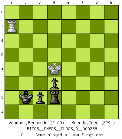 Last move : 0-1 2023 July 1 20:22:49 [Event "FICGS__CHESS__CLASS_A__000259"] [Site "FICGS"] [Date "2022.06.21"] [Round "1"] [White "Vasquez,Fernando"] [Black "Maceda,Coco"] [Result "0-1"] [WhiteElo "2100"] [BlackElo "2244"] 1.e4 e5 2.Nf3 Nc6 3.d4 exd4 4.Nxd4 Nf6 5.Nxc6 bxc6 6.e5 Qe7 7.Qe2 Nd5 8.c4 Ba6 9.b3 g6 10.f4 d6 11.Qf2 Nb6 12.Ba3 f6 13.c5 Bxf1 14.Kxf1 fxe5 15.cxb6 axb6 16.Qc2 Kd7 17.Bb2 Bh6 18.Qd3 Qe6 19.Nd2 Rhf8 20.g3 Qh3+ 21.Kg1 exf4 22.Nf3 Ra5 23.Qf1 Qxf1+ 24.Kxf1 fxg3 25.Kg2 Rc5 26.Kxg3 Bf4+ 27.Kh3 Rc2 28.Bg7 Rf7 29.Bh8 c5 30.Ne1 Rf2 31.Rd1 Rxa2 32.Nd3 Re2 33.Nxf4 Rxf4 34.Rd3 R4f2 35.Bc3 Kc6 36.Be1 Rf4 37.Bg3 Rb4 38.Re1 Rb2 39.R1e3 g5 40.Be1 Rd4 41.Rc3 b5 42.Re7 Rb4 43.R7e3 h5 44.Bg3 Rd4 45.Re6 Rd1 46.Rg6 Rdb1 47.Rxg5 Rxb3 48.Rc2 R3b2 49.Rc3 b4 50.Re3 b3 51.Rxh5 Rd2 52.Rh8 b2 53.Rb8 c4 54.Be1 Rc2 55.Rc3 Rbc1 56.Rxb2 Rxc3+ 57.Bxc3 Rxc3+ 58.Kg2 Rb3 59.Rc2 c3 60.Kf3 Kc5 61.Ke3 Kc4 62.Rg2 Rb2 63.Rg4+ Kb3 64.Rg7 Rxh2 65.Rxc7 Rd2 66.Rb7+ Kc2 67.Ra7 d5 68.Ra2+ Kc1 69.Ra1+ Kb2 70.Ra7 d4+ 71.Ke4 d3 72.Kd4 c2 0-1 Scotch : Mieses variation 10 pieces endgame at move 56 : White KRBP , Black KRRPPP WHITE : King + 1 Rook 1 Bishop 1 Pawn BLACK : King + 2 Rooks 3 Pawns 9 pieces endgame at move 57 : White KRBP , Black KRPPP WHITE : King + 1 Rook 1 Bishop 1 Pawn BLACK : King + 1 Rook 3 Pawns 8 pieces endgame at move 57 : White KRP , Black KRPPP WHITE : King + 1 Rook 1 Pawn BLACK : King + 1 Rook 3 Pawns 7 pieces endgame at move 64 : White KR , Black KRPPP WHITE : King + 1 Rook BLACK : King + 1 Rook 3 Pawns 6 pieces endgame at move 65 : White KR , Black KRPP WHITE : King + 1 Rook BLACK : King + 1 Rook 2 Pawns Player Black won this chess game. Follow this game move after move (download)A bad day of Chess is better than any good day at work. (Anonymous) Frage des Reporters: -Worin besteht das Ziel von Gambiteröffnungen? Antwort: -Auf Kosten der Partie einen Ruf als Angriffspieler zu erwerben.- (Siegbert Tarrasch) Cuando tengo las piezas blancas, yo gano porque soy blanco; Cuando tengo las piezas negras, yo gano porque soy Bogolyubov. (Bogolyubov) Toutes les manuvres exécutées sur une colonne ouverte ont pour but ultime l'intrusion définitive sur la septième ou la huitième rangée, en plein cur de la position ennemie. (Aaron Nimzovitch) Bobby never cared about money, though. His only desire was to prove that his choices were correct: He wanted chess to be important because he was a chess player, and he wanted to be important. Bobby knew money was important, but he didn't have a clue why, outside of clothes and status. The only way he could accomplish what he wanted was to fight for a lot of money. Once he got it, he gave it away. He did not know how to spend it. And once he'd become champion, after, essentially, sacrificing his life for it, he didn't know how to spend his time. (Bob Wade)