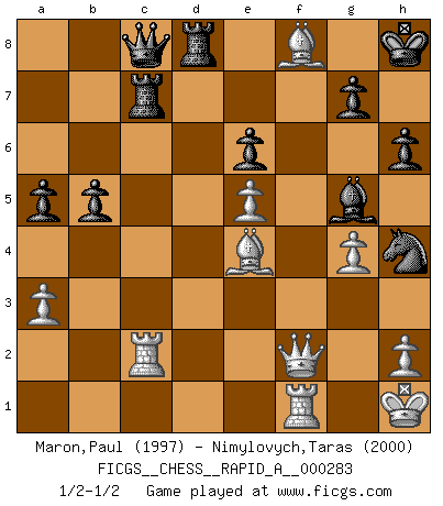 Last move : 1/2-1/2 2022 September 14 15:54:33 [Event "FICGS__CHESS__RAPID_A__000283"] [Site "FICGS"] [Date "2022.06.21"] [Round "1"] [White "Maron,Paul"] [Black "Nimylovych,Taras"] [Result "1/2-1/2"] [WhiteElo "1997"] [BlackElo "2000"] 1.d4 Nf6 2.Nf3 e6 3.e3 d5 4.Bd3 Be7 5.Nbd2 O-O 6.O-O b6 7.b3 Ba6 8.c4 Nbd7 9.Bb2 c5 10.Ne5 Bb7 11.Qc2 h6 12.Ndf3 Rc8 13.Rad1 cxd4 14.exd4 Rc7 15.Qe2 Re8 16.Nd2 dxc4 17.bxc4 Nxe5 18.dxe5 Nd7 19.Ne4 Bxe4 20.Qxe4 Nf8 21.Kh1 Qa8 22.Qe2 Ng6 23.f4 Nh4 24.Be4 Qc8 25.g3 Nf5 26.g4 Nh4 27.f5 Bg5 28.fxe6 fxe6 29.c5 Rxc5 30.Qf2 Rc7 31.Ba3 Kh8 32.Bf8 b5 33.Rde1 a6 34.Re2 Rd8 35.a3 a5 36.Rc2 1/2-1/2 Queen's pawn : Yusupov-Rubinstein system Kingside Castling by player Black (move 5) Kingside Castling by player White (move 6) This chess game ended in a draw. Follow this game move after move (download)Chess is a foolish expedient for making idle people believe they are doing something very clever when they are only wasting their time. (George Bernard Shaw) Auf Remis zu spielen ist gewissermaßen ein Verbrechen gegen das Schachspiel. (Mikhail Nekhemyevich Tal) El Ajedrez es tortura mental. (Garry Kasparov) Il n'y a pas de prix trop élevé au scalp de l'ennemi. (Koblentz) The message for business people contemplating their place in the cyberspace is simple and direct: get linked or get lost. (Vic Sussman and Kenan Pollack)