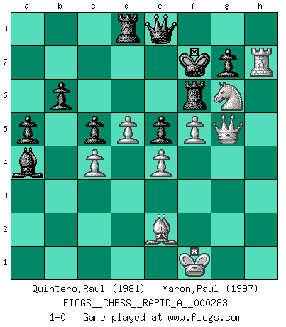 Last move : 1-0 2022 October 30 19:6:22 [Event "FICGS__CHESS__RAPID_A__000283"] [Site "FICGS"] [Date "2022.06.21"] [Round "1"] [White "Quintero,Raul"] [Black "Maron,Paul"] [Result "1-0"] [WhiteElo "1981"] [BlackElo "1997"] 1.Nf3 Nf6 2.b3 d5 3.e3 e6 4.Bb2 Nbd7 5.d4 Bd6 6.Bd3 O-O 7.O-O b6 8.c4 dxc4 9.bxc4 Bb7 10.Nc3 a6 11.e4 c5 12.d5 Qc7 13.Rb1 Rfe8 14.Re1 Ng4 15.h3 Nge5 16.Nxe5 Nxe5 17.Bf1 Nd7 18.g3 Be5 19.f4 Bd4+ 20.Kh2 e5 21.Qf3 Nf6 22.Bd3 Rab8 23.a4 Bc8 24.Bc2 Qd8 25.Ne2 Bxb2 26.Rxb2 Qd7 27.g4 Qd8 28.f5 h6 29.Nc3 a5 30.Kg2 Nh7 31.Qg3 Ba6 32.Bd3 Qf6 33.Reb1 Red8 34.Ne2 Rd6 35.Ng1 Qe7 36.Nf3 f6 37.h4 Bc8 38.g5 hxg5 39.hxg5 Nxg5 40.Rh1 Bd7 41.Qh2 Qf8 42.Nh4 Qe8 43.Ng6 Bxa4 44.Qh5 Rbd8 45.Kf1 Qd7 46.Be2 Re8 47.Bd3 Rd8 48.Rg2 Qe8 49.Be2 Kf7 50.Rxg5 fxg5 51.Qxg5 Rf6 52.Rh7 1-0 Reti Opening Kingside Castling by player Black (move 6) Kingside Castling by player White (move 7) Player White won this chess game. Follow this game move after move (download)Human affairs are like a Chess game: only those who do not take it seriously can be called good players. (Hung Tzu Ch'eng) Schach ist die gewalttätigste aller Sportarten. (Garry Kasparov) El Ajedrez es un expediente tonto que hace creer a la gente inactiva que hacen una cosa muy astuta cuando solamente estan perdiendo su tiempo. (George Bernard Shaw) Ce qui caractérise les parties de combat, c'est que si le défenseur a constamment de difficiles problèmes à résoudre, l'attaquant doit chercher sans relâche de nouvelles possibilités d'attaque. (Koblentz) A generalist learns less and less about more and more until he knows nothing about everything. (Author unknown)