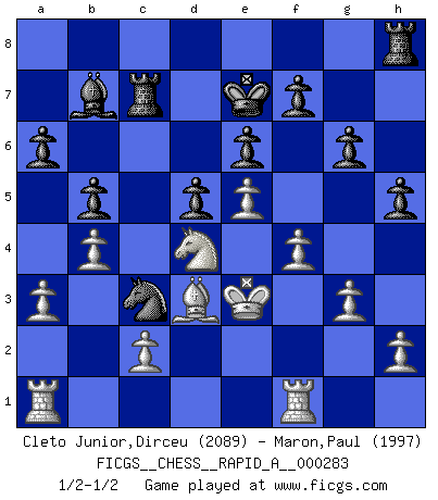 Last move : 1/2-1/2 2022 July 26 20:14:3 [Event "FICGS__CHESS__RAPID_A__000283"] [Site "FICGS"] [Date "2022.06.21"] [Round "1"] [White "Cleto Junior,Dirceu"] [Black "Maron,Paul"] [Result "1/2-1/2"] [WhiteElo "2089"] [BlackElo "1997"] 1.e4 e6 2.d4 d5 3.Nc3 Nf6 4.e5 Nfd7 5.f4 c5 6.Nf3 Nc6 7.Be3 a6 8.Qd2 b5 9.a3 Qa5 10.dxc5 Bxc5 11.Bxc5 Nxc5 12.Nd4 Nxd4 13.Qxd4 Na4 14.b4 Qb6 15.Qxb6 Nxb6 16.Bd3 Bd7 17.Ne2 h5 18.Nd4 g6 19.Kf2 Ke7 20.Ke3 Rac8 21.Kd2 Bc6 22.Rhf1 Bb7 23.g3 Na4 24.Rg1 Rhd8 25.Be2 Rh8 26.Rgf1 Nc3 27.Bd3 Rc7 28.Ke3 1/2-1/2 French : Steinitz, Boleslavsky variation This chess game ended in a draw. Follow this game move after move (download)If you aren't afraid of Spassky, then I have removed the element of money. (Jim Slater) Im Schach nämlich geht es darum, daß Ich des Gegners klein zu kriegen, sein Ego zu zerbrechen und zu zermahlen, seine Selbstachtung zu zertreten und zu verscharren und seine ganze mißachtenswerte sogenannte Persönlichkeit ein für alle Mal tot zu hacken und zu zerstampfen und dadurch die menschliche Gesellschaft von einer stinkenden Pestbeule zu befreien. Es ist ein königliches Spiel. (Robert James Fischer) ¿Porque tengo que perder ante este idiota?. (Aron Nimzovich) La vérité est comme le meilleur coup aux échecs : elle existe, mais il faut la chercher. (Arturo Perez-Reverte) Wawaweewa ! (Borat: Cultural learnings of America for make benefit glorious nation of Kazakhstan)