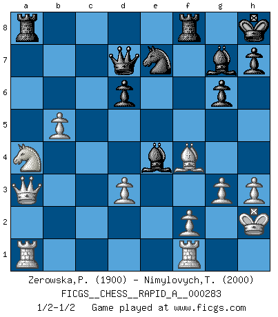 Last move : 1/2-1/2 2022 July 31 17:42:10 [Event "FICGS__CHESS__RAPID_A__000283"] [Site "FICGS"] [Date "2022.06.21"] [Round "1"] [White "Zerowska,Patrycja"] [Black "Nimylovych,Taras"] [Result "1/2-1/2"] [WhiteElo "1900"] [BlackElo "2000"] 1.g3 c5 2.Bg2 Nc6 3.c4 g6 4.Nc3 Bg7 5.Nf3 d6 6.O-O Bf5 7.h3 e5 8.a3 a5 9.d3 Nge7 10.Rb1 O-O 11.Bd2 Be6 12.Qc1 f6 13.Kh2 Kh8 14.Ng1 Rb8 15.b3 b6 16.Nd5 b5 17.cxb5 Rxb5 18.Nxe7 Nxe7 19.b4 cxb4 20.axb4 a4 21.e3 Qd7 22.Ne2 Bb3 23.Qa3 f5 24.Nc3 R5b8 25.Ra1 f4 26.Nxa4 Be6 27.exf4 exf4 28.Bxf4 Bd5 29.Be4 Ra8 30.b5 Bxe4 1/2-1/2 Benko's Opening Kingside Castling by player White (move 6) Kingside Castling by player Black (move 10) This chess game ended in a draw. Follow this game move after move (download)All I want to do, ever, is just play Chess. (Bobby Fischer) Es ist wirklich schade, dass so viele Schachspieler nicht auf ihr Äußeres achten! (Alexandra Kosteniuk) Si un gobernante no entiende al Ajedrez, ¿como puede governar él un reinado?. (El Rey Khusros II) En blitz, le Cavalier l'emporte sur le Fou. (Vlastimil Hort) CHESS, n. f. [echecs, Fr.] A nice and abstruse game, in which two sets of puppets are moved in opposition to each other. (Dr Samuel Johnson, A Dictionary Of The English Language, 1755)