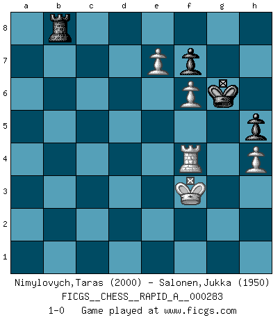Last move : 1-0 2022 September 10 17:2:37 [Event "FICGS__CHESS__RAPID_A__000283"] [Site "FICGS"] [Date "2022.06.21"] [Round "1"] [White "Nimylovych,Taras"] [Black "Salonen,Jukka"] [Result "1-0"] [WhiteElo "2000"] [BlackElo "1950"] 1.e4 e5 2.Nf3 Nc6 3.Bb5 a6 4.Ba4 Nf6 5.O-O b5 6.Bb3 Bc5 7.c3 d6 8.d4 Bb6 9.a4 Rb8 10.axb5 axb5 11.Na3 O-O 12.Nxb5 exd4 13.cxd4 Bg4 14.Ba4 d5 15.e5 Ne4 16.Be3 Na5 17.Qd3 Nc4 18.Bc1 c6 19.Nc3 Bxf3 20.gxf3 Nxc3 21.bxc3 c5 22.Bd1 cxd4 23.cxd4 Qh4 24.f4 Rbc8 25.Kg2 Rc6 26.h3 Rg6+ 27.Kh2 Rh6 28.Ra6 Rd8 29.f5 Rc6 30.f6 Kh8 31.Bb3 Re6 32.fxg7+ Kg8 33.f4 Rg6 34.f5 Rxg7 35.Bf4 Bxd4 36.Bxc4 dxc4 37.Qf3 h5 38.Rh6 Rh7 39.Rxh7 Kxh7 40.f6 Bc5 41.e6 Qxf4+ 42.Qxf4 Bd6 43.e7 Bxf4+ 44.Rxf4 Re8 45.Rxc4 Kg6 46.Rf4 Ra8 47.h4 Re8 48.Kg2 Rb8 49.Kf3 1-0 Ruy Lopez : 5.O-O Kingside Castling by player White (move 5) Kingside Castling by player Black (move 11) 10 pieces endgame at move 44 : White KRPPP , Black KRPPP WHITE : King + 1 Rook 3 Pawns BLACK : King + 1 Rook 3 Pawns 9 pieces endgame at move 45 : White KRPPP , Black KRPP WHITE : King + 1 Rook 3 Pawns BLACK : King + 1 Rook 2 Pawns Player White won this chess game. Follow this game move after move (download)Bobby is the finest Chess player this country ever produced. His memory for the moves, his brilliance in dreaming up combinations, and his fierce determination to win are uncanny. (John Collins) Die Fehler sind da, Sie warten nur darauf gemacht zu werden. (Savielly Grigorievitsch Tartakower) La vida es como un juego de Ajedrez, cambiando con cada movimiento. (Proverbio Chino) Je ne suis pas le dernier à jouer lâchement des coups douteux pendant le zeïtnot de l'adversaire pour l'achever: en effet les coups qui font le plus peur sont ceux que l'on ne comprend pas. Je me fais souvent peur quand je joue. (Un professeur anonyme) I don't believe in psychology. I believe in good moves. (Bobby Fischer)