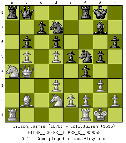 Last move : 0-1 2008 January 24 11:39:22 [Event "FICGS__CHESS__CLASS_D__000055"] [Site "FICGS"] [Date "2007.08.02"] [Round "1"] [White "Wilson,Jaimie"] [Black "Coll,Julien"] [Result "0-1"] [WhiteElo "1676"] [BlackElo "1516"] 1.c4 Nf6 2.Nf3 g6 3.Nc3 Bg7 4.g3 O-O 5.Bg2 d6 6.O-O e5 7.d3 Nc6 8.Rb1 a5 9.a3 h6 10.b4 axb4 11.axb4 Be6 12.b5 Ne7 13.Qb3 Nd7 14.Qb4 f5 15.Nd2 Qb8 16.Na4 f4 17.Bb2 g5 18.Ra1 Nf5 19.Bd5 Bxd5 20.cxd5 b6 0-1 This chess game has been lost on time (started : 2007.08.02 12:3:5) English Opening Kingside Castling by player Black (move 4) Kingside Castling by player White (move 6) Player Black won this chess game. Follow this game move after move (download)The game of Chess is not merely an idle amusement; several very valuable qualities of the mind are to be acquired and strengthened by it, so as to become habits ready on all occasions; for life is a kind of Chess. (Benjamin Franklin) Ich habe Kasparov in Rente geschickt. (Veselin Topalov) Entre mas años cumplo, mas valoro los Peones. (Keres) Psychologiquement, tu dois avoir confiance en toi même, mais cette confiance doit être basée sur des faits. (Robert Fischer) Excelling at chess has long been considered a symbol of more general intelligence. That is an incorrect assumption in my view, as pleasant as it might be. But for the purposes of argument and investigation, chess is, in Russkin-Gutman's words, 'an unparalleled laboratory, since both the learning process and the degree of ability obtained can be objectified and quantified, providing an excellent comparative framework on which to use rigorous analytical techniques.' (The Chess Master and the Computer, by Garry Kasparov - 2010)