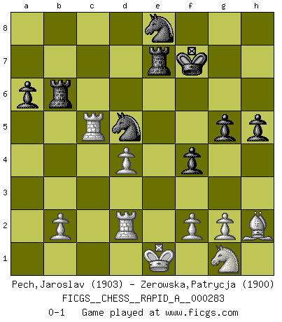 Last move : 0-1 2022 September 21 4:51:56 [Event "FICGS__CHESS__RAPID_A__000283"] [Site "FICGS"] [Date "2022.06.21"] [Round "1"] [White "Pech,Jaroslav"] [Black "Zerowska,Patrycja"] [Result "0-1"] [WhiteElo "1903"] [BlackElo "1900"] 1.d4 Nf6 2.c4 e6 3.Nc3 Bb4 4.e3 O-O 5.Bd3 d5 6.Nf3 dxc4 7.Bxc4 c5 8.O-O cxd4 9.exd4 b6 10.Bg5 Bb7 11.Qe2 Nbd7 12.Rac1 Bxc3 13.Rxc3 Qb8 14.Bh4 Qf4 15.Bg3 Qg4 16.Bb5 Rfd8 17.Rfc1 Nd5 18.R3c2 a6 19.h3 Qh5 20.Bc6 Bxc6 21.Rxc6 N7f6 22.a3 h6 23.Qc2 Qf5 24.Qxf5 exf5 25.Be5 Ne8 26.Kf1 f6 27.Bh2 Kf7 28.Ng1 g5 29.Ne2 b5 30.a4 bxa4 31.R1c4 Ra7 32.Rxa4 Rb7 33.Rc2 Rb6 34.Ra5 Rd7 35.Rd2 Kg6 36.Rc5 Rb4 37.Ra5 Rb6 38.Rc5 Kf7 39.Ke1 h5 40.h4 f4 41.hxg5 fxg5 42.Ng1 Re7+ 0-1 Nimzo-Indian : 4.e3 O-O, 5.Bd3 d5 Kingside Castling by player Black (move 4) Kingside Castling by player White (move 8) Player Black won this chess game. Follow this game move after move (download)You know, comrade Pachman, I don't enjoy being a Minister, I would rather play Chess like you. (Che Guevara) Wie, soll nun auch die Opposition abgeschafft werden? Ja, es tut mir leid, Ihnen diesen Schmerz nicht ersparen zu können. (Aaron Nimzowitsch) Debes de llevar a tu oponente hacia un profundo y obscuro bosque donde 2+2=5, y el camino que conduce a la salida es suficientemente ancho para solamente uno. (Mikhail Tal) Il s'avisa de me proposer d'apprendre les échecs qu'il jouait un peu... me voilà forcené des échecs. J'achète un échiquier, je m'enferme dans ma chambre, j'y passe des jours et des nuits à vouloir apprendre par cur toutes les parties. (Jean-Jacques Rousseau, Confessions) I fear not the man who has practiced 10,000 kicks once, but I fear the man who has practiced one kick 10,000 times. (Bruce Lee)