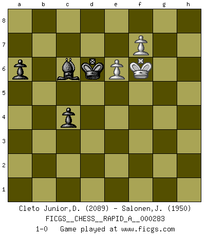 Last move : 1-0 2022 August 13 7:8:30 [Event "FICGS__CHESS__RAPID_A__000283"] [Site "FICGS"] [Date "2022.06.21"] [Round "1"] [White "Cleto Junior,Dirceu"] [Black "Salonen,Jukka"] [Result "1-0"] [WhiteElo "2089"] [BlackElo "1950"] 1.d4 d5 2.c4 c6 3.Nf3 Nf6 4.Nc3 e6 5.Bg5 h6 6.Bh4 dxc4 7.e4 g5 8.Bg3 b5 9.Be2 Bb7 10.h4 b4 11.hxg5 bxc3 12.bxc3 Nxe4 13.Be5 Nxc3 14.Qc2 Nxe2 15.Kxe2 Rg8 16.gxh6 Bxh6 17.Qh7 Rg6 18.Rxh6 Rxh6 19.Qxh6 Nd7 20.Bd6 Qf6 21.Rh1 Qxh6 22.Rxh6 O-O-O 23.Ng5 Ba6 24.Nxf7 c3 25.Ke1 Rg8 26.Bg3 Kb7 27.Rxe6 Kb6 28.Re3 Bc4 29.Ne5 Nxe5 30.dxe5 Be6 31.Rxc3 Bxa2 32.f4 Bd5 33.f5 Bxg2 34.e6 Re8 35.Rb3+ Kc5 36.Rb8 Rxb8 37.Bxb8 Bd5 38.Kf2 Kd4 39.Kg3 Ke4 40.Kg4 c5 41.Kg5 c4 42.Bd6 a6 43.Kg6 Bc6 44.f6 Kd5 45.f7 Kxd6 46.Kf6 1-0 QGD Slav : 4.Nc3 Queenside Castling by player Black (move 22) 10 pieces endgame at move 33 : White KRBPP , Black KRBPP WHITE : King + 1 Rook 1 Bishop 2 Pawns BLACK : King + 1 Rook 1 Bishop 2 Pawns 9 pieces endgame at move 36 : White KBPP , Black KRBPP WHITE : King + 1 Bishop 2 Pawns BLACK : King + 1 Rook 1 Bishop 2 Pawns 8 pieces endgame at move 37 : White KBPP , Black KBPP WHITE : King + 1 Bishop 2 Pawns BLACK : King + 1 Bishop 2 Pawns 7 pieces endgame at move 45 : White KPP , Black KBPP WHITE : King + 2 Pawns BLACK : King + 1 Bishop 2 Pawns Player White won this chess game. Follow this game move after move (download)With or without the title, Bobby Fischer was unquestionably the greatest player of his time. (Burt Hochberg) Man braucht nicht immer den besten Zug zu spielen: Ein Zug muß aktiv, unternehmungslustig, korrekt und schön sein. (David Bronstein) El Ajedrez demanda una total concentración. (Bobby Fischer) Karpov est une pièce de musée. (Garry Kasparov) If you ain't just a little scared when you enter a casino, you are either very rich or you haven't studied the games enough. (Pappy)