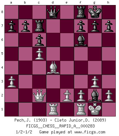 Last move : 1/2-1/2 2022 August 19 3:23:15 [Event "FICGS__CHESS__RAPID_A__000283"] [Site "FICGS"] [Date "2022.06.21"] [Round "1"] [White "Pech,Jaroslav"] [Black "Cleto Junior,Dirceu"] [Result "1/2-1/2"] [WhiteElo "1903"] [BlackElo "2089"] 1.c4 Nf6 2.Nc3 e5 3.Nf3 Nc6 4.g3 d5 5.cxd5 Nxd5 6.Bg2 Nb6 7.O-O Be7 8.d3 O-O 9.a3 Be6 10.b4 Nd4 11.Rb1 Nxf3+ 12.Bxf3 c6 13.Qc2 Rc8 14.Ne4 Nd7 15.Nc5 Nxc5 16.bxc5 Rc7 17.Bb2 Bf6 18.Bg2 Ba2 19.Rbd1 Bd5 20.d4 exd4 21.Bxd4 Bxg2 1/2-1/2 English Opening Kingside Castling by player White (move 7) Kingside Castling by player Black (move 8) This chess game ended in a draw. Follow this game move after move (download)Good offense and good defense both begin with good development. (Bruce A. Moon) Wenn Du absolut nicht mehr weißt, was Du tun sollst, dann ist es Zeit für Panik. (John van der Wiel) La enorme capacidad mental, en la que sin ella no puede un jugador de Ajedrez existir, es demasiado requerida por el Ajedrez al grado de que nunca podrá liberar su mente de este juego. (Albert Einstein) Il n'y a pas de prix trop élevé au scalp de l'ennemi. (Koblentz) I'm extremely disappointed. I send you out for exciting, new designer drugs, you come back with tomato sauce. (Gregory House, House M.D.)