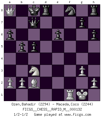 Last move : 1/2-1/2 2022 July 23 22:19:27 [Event "FICGS__CHESS__RAPID_M__000132"] [Site "FICGS"] [Date "2022.06.25"] [Round "1"] [White "Ozen,Bahadir"] [Black "Maceda,Coco"] [Result "1/2-1/2"] [WhiteElo "2294"] [BlackElo "2244"] 1.Nf3 Nf6 2.c4 e6 3.Nc3 d5 4.d4 c6 5.e3 Nbd7 6.Bd3 dxc4 7.Bxc4 b5 8.Bd3 Bb7 9.O-O a6 10.e4 c5 11.d5 Qc7 12.dxe6 fxe6 13.Bc2 Bd6 14.Ng5 Nf8 15.f4 O-O-O 16.Qe2 h6 17.Nf3 Bxf4 18.Bxf4 Qxf4 19.Rae1 Ng4 20.g3 Qb8 21.e5 Bxf3 22.Qxf3 Nxe5 23.Rxe5 Qxe5 24.Qc6+ Qc7 25.Qa8+ 1/2-1/2 Reti Opening Kingside Castling by player White (move 9) Queenside Castling by player Black (move 15) This chess game ended in a draw. Follow this game move after move (download)It's always better to sacrifice your opponent's men. (Savielly Tartakover) Mutter, ich bin eben Ex-Weltmeister geworden. --beim nach Hause Kommen nach dem Verlust des WM-Titels an Mihail Botvinnik -- (Mikhail Nekhemyevich Tal) No puedes jugar al Ajedrez si eres de corazón noble. (Proverbio Francés) Je ne crois pas en la psychologie, je crois aux bons coups. (Robert Fischer) No, I am still playing. (Anatoly Karpov)