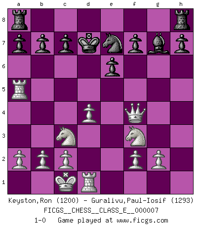 Last move : 1-0 2006 July 11 16:55:12 [Event "FICGS__CHESS__CLASS_E__000007"] [Site "FICGS"] [Date "2006.06.27"] [Round "1"] [White "Keyston,Ron"] [Black "Guralivu,Paul-Iosif"] [Result "1-0"] [WhiteElo "1200"] [BlackElo "1293"] 1.e4 e6 2.d4 d5 3.Nc3 Ne7 4.Nf3 g6 5.h4 Bg7 6.h5 gxh5 7.Bf4 Ng6 8.Qd2 Nxf4 9.Qxf4 dxe4 10.Nxe4 Nc6 11.O-O-O Qd5 12.Nc3 Qa5 13.Bb5 Bd7 14.Rxh5 Ne7 15.Bxd7+ Kxd7 16.Rxa5 1-0 French : Paulsen variation Queenside Castling by player White (move 11) Player White won this chess game. Follow this game move after move (download)I guess a certain amount of temperament is expected of Chess geniuses. (Ron Gross) Das Schachspiel übertrifft alle anderen Spiele so weit wie der Chimborasso einen Misthaufen. (Arthur Schopenhauer) En un gambito tu regalas un Peón por el bién de tomar un juego perdido. (Samuel Standige Boden) Le jeu d'échecs fait naître et fortifie en nous plusieurs qualités précieuses dans le cours de l'existence, telles que la prévoyance, la circonspection, la prudence, et la persévérance. (Benjamin Franklin - 1783, la morale des échecs) Perhaps the current trend of many chess professionals taking up the more lucrative pastime of poker is not a wholly negative one. It may not be too late for humans to relearn how to take risks in order to innovate and thereby maintain the advanced lifestyles we enjoy. And if it takes a poker-playing supercomputer to remind us that we can't enjoy the rewards without taking the risks, so be it. (The Chess Master and the Computer, by Garry Kasparov - 2010)