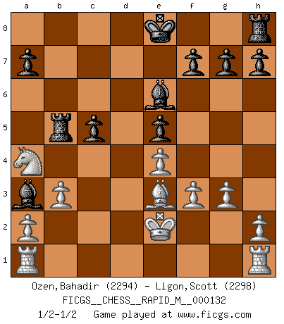 Last move : 1/2-1/2 2022 July 2 20:29:43 [Event "FICGS__CHESS__RAPID_M__000132"] [Site "FICGS"] [Date "2022.06.25"] [Round "1"] [White "Ozen,Bahadir"] [Black "Ligon,Scott"] [Result "1/2-1/2"] [WhiteElo "2294"] [BlackElo "2298"] 1.Nf3 Nf6 2.g3 c5 3.Bg2 Nc6 4.c4 d5 5.cxd5 Nxd5 6.d4 cxd4 7.Nxd4 Ndb4 8.Nxc6 Qxd1+ 9.Kxd1 Nxc6 10.Nc3 Bf5 11.Bxc6+ bxc6 12.f3 e5 13.e4 Be6 14.Be3 Rb8 15.b3 Ba3 16.Na4 Rb5 17.Ke2 c5 18.Bc1 Bb4 19.Be3 Ba3 1/2-1/2 Reti Opening This chess game ended in a draw. Follow this game move after move (download)Chess is 99 percent tactics. (Teichmann) Ein Gewinn durch eine ungenaue Kombination, sei sie auch noch so vorzeigbar, erfüllt mich mit Schaudern. (Wilhelm Steinitz) Fischer era un maestro de claridad y un Rey del posicionamiento astuto. Sus oponentes podían ver hacia donde se dirigía pero eran impotentes para detenerlo. (Bruce Pandolfini) La vérité est comme le meilleur coup aux échecs : elle existe, mais il faut la chercher. (Arturo Perez-Reverte) Life is pain my dear and anyone who says otherwise is selling something. (Princess Bride)