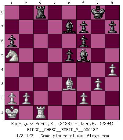 Last move : 1/2-1/2 2022 August 31 18:37:44 [Event "FICGS__CHESS__RAPID_M__000132"] [Site "FICGS"] [Date "2022.06.25"] [Round "1"] [White "Rodriguez Perez,Rene"] [Black "Ozen,Bahadir"] [Result "1/2-1/2"] [WhiteElo "2128"] [BlackElo "2294"] 1.e4 c5 2.Nf3 d6 3.d4 cxd4 4.Qxd4 Nf6 5.Nc3 Nc6 6.Bb5 Bd7 7.Bxc6 Bxc6 8.Bg5 e6 9.O-O-O Be7 10.Kb1 O-O 11.Qd3 Rc8 12.h4 b5 13.e5 dxe5 14.Nxe5 Qxd3 15.Rxd3 Ba8 16.Nd7 Rfd8 17.Nxb5 Be4 18.Nxf6+ gxf6 19.Rxd8+ Bxd8 20.Be3 Bxc2+ 21.Ka1 a6 22.Nd6 Rc6 23.Nb7 Be7 24.Na5 Rc8 25.Rc1 e5 26.g3 Bf5 1/2-1/2 Sicilian, Chekhover variation Queenside Castling by player White (move 9) Kingside Castling by player Black (move 10) This chess game ended in a draw. Follow this game move after move (download)When I asked Fischer why he had not played a certain move in our game, he replied: 'Well, you laughed when I wrote it down !' (Mikhail Tal) Ich spiele ehrlich und spiele, um zu gewinnen. Wenn ich verliere nehme ich meine Medizin. (Robert James Fischer) Con o sin el título, Bobby Fischer fue sin lugar a dudas el mas grande jugador de su época. (Burt Hochberg) Nous sommes les pions de la mystérieuse partie d'Echecs jouée par Dieu. Il nous déplace, nous arrête, nous pousse encore, puis nous lance un à un dans la boîte du Néant. Epitaphe sur la tombe de David Janowsky (1868-1927). They misunderestimated me. (George W. Bush, Bentonville nov. 6, 2000)