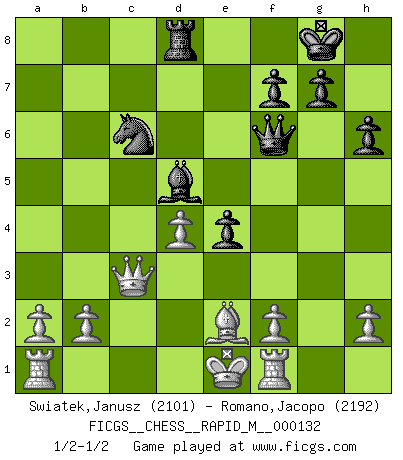Last move : 1/2-1/2 2022 July 23 13:15:43 [Event "FICGS__CHESS__RAPID_M__000132"] [Site "FICGS"] [Date "2022.06.25"] [Round "1"] [White "Swiatek,Janusz"] [Black "Romano,Jacopo"] [Result "1/2-1/2"] [WhiteElo "2101"] [BlackElo "2192"] 1.d4 Nf6 2.c4 e6 3.Nf3 d5 4.Nc3 a6 5.cxd5 exd5 6.Bg5 Be6 7.Bxf6 Qxf6 8.Qb3 Ra7 9.Nxd5 Qd8 10.e4 c6 11.Qb6 cxd5 12.Qxa7 dxe4 13.Nd2 Bb4 14.Qxb7 Bxd2+ 15.Kxd2 O-O 16.Be2 Bd5 17.Qb4 Qg5+ 18.Ke1 Nc6 19.Qc5 Qxg2 20.Rf1 Rd8 21.Bxa6 Qg5 22.Be2 h6 23.Qc3 Qf6 1/2-1/2 Queen's pawn game Kingside Castling by player Black (move 15) This chess game ended in a draw. Follow this game move after move (download)No other master has such a terrific will to win. At the board he radiates danger, and even the strongest opponents tend to freeze, like rabbits when they smell a panther. Even his weaknesses are dangerous. As white, his opening game is predictable - you can make plans against it - but so strong that your plans almost never work. In the middle game his precision and invention are fabulous, and in the end game you simply cannot beat him. (Anonymous German Expert) Kein Schachspieler kann gut schlafen. (H. G. Wells) El Ajedrez es en su esencia, un juego. En su forma, un arte. Y en su ejecución, una ciencia. (Baron Tassilo) Aux échecs, l'amour-propre est satisfait quand on remporte la victoire, mais il n'y a pas de honte à être battu. (Benjamin Franklin) A married woman is like a fish riding a bicycle. (Rodolfo d'Ettorre)