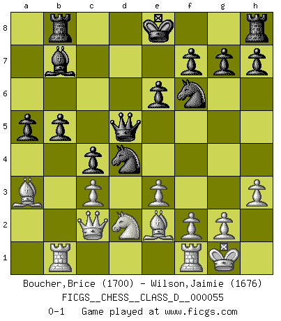 Last move : 0-1 2007 December 2 8:41:34 [Event "FICGS__CHESS__CLASS_D__000055"] [Site "FICGS"] [Date "2007.08.02"] [Round "1"] [White "Boucher,Brice"] [Black "Wilson,Jaimie"] [Result "0-1"] [WhiteElo "1700"] [BlackElo "1676"] 1.d4 d5 2.c4 e6 3.Nc3 c6 4.Nf3 dxc4 5.e3 b5 6.a4 Bb4 7.Be2 a5 8.O-O Nf6 9.axb5 Bxc3 10.bxc3 cxb5 11.Ba3 Bb7 12.Qc2 Nc6 13.Rab1 Qd5 14.h3 Rb8 15.Nd2 Nxd4 0-1 QGD : Semi-Slav, Noteboom variation Kingside Castling by player White (move 8) Player Black won this chess game. Follow this game move after move (download)No price is too great for the scalp of the enemy King. (Koblentz) Schach wird sich dank seiner hohen kulturellen Tradition immer durchsetzen. In näherer Zukunft womöglich sogar als Gegenreaktion auf die maßlose Reizüberflutung im Freizeit- und Spielbereich. (Garry Kasparov) El Ajedrez es tortura mental. (Garry Kasparov) Les échecs sont plus proches de l'art de l'assassinat que de l'art de la guerre. (Arturo Perez-Reverte) Whoever said the pen is mightier than the sword obviously never encountered automatic weapons. (US General Douglas MacArthur)