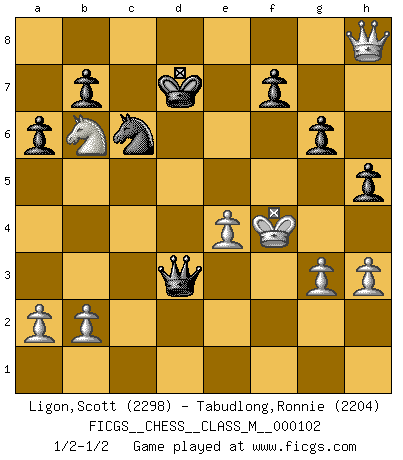 Last move : 1/2-1/2 2022 July 21 18:50:49 [Event "FICGS__CHESS__CLASS_M__000102"] [Site "FICGS"] [Date "2022.06.26"] [Round "1"] [White "Ligon,Scott"] [Black "Tabudlong,Ronnie"] [Result "1/2-1/2"] [WhiteElo "2298"] [BlackElo "2204"] 1.e4 c5 2.d4 cxd4 3.c3 dxc3 4.Nxc3 Nc6 5.Nf3 d6 6.Bc4 a6 7.O-O Nf6 8.Bf4 e6 9.Qe2 Nh5 10.Be3 Be7 11.Rfd1 Bd7 12.Nd4 g6 13.Nxc6 Bxc6 14.Bh6 Bg5 15.Bxg5 Qxg5 16.Rxd6 Ke7 17.Rad1 Rhd8 18.Rxd8 Rxd8 19.Rxd8 Kxd8 20.Qd1+ Ke7 21.Qd4 Qc1+ 22.Bf1 Nf6 23.f3 Nd7 24.Ne2 Qg5 25.Qb4+ Ke8 26.Qc3 Bb5 27.Kf2 Kd8 28.Ng3 h5 29.Bxb5 Qxb5 30.Ne2 Qb6+ 31.Qd4 Qa5 32.Nc3 Qc7 33.g3 Ke8 34.f4 e5 35.fxe5 Nxe5 36.h3 Nc6 37.Qh8+ Kd7 38.Nd5 Qa5 39.Kf3 Qb5 40.Kf4 Qd3 41.Nb6+ Ke7 42.Nd5+ Kd7 43.Nb6+ 1/2-1/2 Sicilian : Smith-Morra gambit Kingside Castling by player White (move 7) This chess game ended in a draw. Follow this game move after move (download)No price is too great for the scalp of the enemy King. (Koblentz) Jeder weiß, dass Gasprom Putins persönliches Machtinstrument ist. Die Firma wird vom Kreml aus geleitet und wird schon deshalb nie transparent sein. (Garry Kasparov) En partidas rápidas, el Caballo es mas poderoso que el Alfil. (Vlastimil Hort) On croit qu'il y a plus de mauvais joueurs que de bons joueurs, c'est faux : Il y a autant de joueurs qui gagnent que de joueurs qui perdent. (Philippe Geluck) Opportunities multiply as they are seized. (Sun Tzu)
