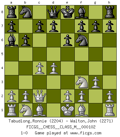 Last move : 1-0 2022 August 7 6:2:11 [Event "FICGS__CHESS__CLASS_M__000102"] [Site "FICGS"] [Date "2022.06.26"] [Round "1"] [White "Tabudlong,Ronnie"] [Black "Walton,John"] [Result "1-0"] [WhiteElo "2204"] [BlackElo "2271"] 1.d4 Nf6 2.c4 e6 3.Nf3 b6 4.g3 Ba6 5.Qc2 1-0 This chess game has been lost on time (started : 2022.06.26 8:15:24) Queen's Indian : Nimzovich variation (exaggerated Fianchetto) Player White won this chess game. Follow this game move after move (download)If your opponent offers you a draw, try to work out why he thinks he's worse off. (Nigel Short) Als er Schachweltmeister wurde ließ er praktisch alle stärksten Sovietspieler für sich arbeiten. Wenn ein auch nur mittelmässiger Meister ein Spezialist für eine bestimmte Eröffnung war, wurde er von Karpov gerufen. Das wurde alles geheim gehalten. (Mikhail Moiseyevich Botvinik) El Ajedrez es un cuento de Hadas de las 1001 metidas de pata. (Savielly Tartakower) Nous sommes les pions de la mystérieuse partie d'Echecs jouée par Dieu. Il nous déplace, nous arrête, nous pousse encore, puis nous lance un à un dans la boîte du Néant. Epitaphe sur la tombe de David Janowsky (1868-1927). Computers make it easier to do a lot of things, but most of the things they make it easier to do don't need to be done. (Andy Rooney)