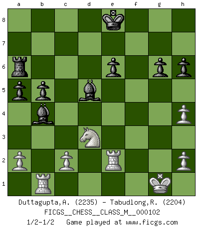 Last move : 1/2-1/2 2022 December 27 15:40:9 [Event "FICGS__CHESS__CLASS_M__000102"] [Site "FICGS"] [Date "2022.06.26"] [Round "1"] [White "Duttagupta,Aniruddha"] [Black "Tabudlong,Ronnie"] [Result "1/2-1/2"] [WhiteElo "2235"] [BlackElo "2204"] 1.e4 c5 2.Nf3 d6 3.d4 cxd4 4.Nxd4 Nf6 5.Nc3 a6 6.Bg5 e6 7.f4 Qb6 8.Qd2 Qxb2 9.Rb1 Qa3 10.e5 dxe5 11.fxe5 h6 12.Bh4 g5 13.exf6 gxh4 14.Be2 Qa5 15.O-O Nd7 16.Kh1 Qg5 17.Qe1 h3 18.gxh3 Qe5 19.Qh4 Bd6 20.Qf2 Rg8 21.Rbd1 Bb4 22.Na4 Rg6 23.Nb6 Rb8 24.Nc4 Rxf6 25.Nxe5 Rxf2 26.Rxf2 Nxe5 27.Bh5 b5 28.Re2 Ng6 29.Bxg6 fxg6 30.Kg1 Rb6 31.Nf3 Bb7 32.Ne5 a5 33.h4 Ra6 34.Rb1 Bd5 35.Nd3 1/2-1/2 Sicilian : Najdorf, 7...Qb6 Kingside Castling by player White (move 15) This chess game ended in a draw. Follow this game move after move (download)By the beauty of his games, the clarity of his play, and the brilliance of his ideas, Fischer made himself an artist of the same stature as Brahms, Rembrandt, and Shakespeare. (David Levy) Stelle das Brett so, daß die Sonne in die Augen deines Gegners scheint. (Ruy López) Yo tuve un dolor de muelas en la primer partida. En el segundo juego, tuve un dolor de cabeza. En el tercero, tuve un ataque de reumatísmo. En la cuarta partida, no me sentía muy bien. ¿Y en el quinto juego? Bueno, ¿que acaso uno tiene que ganar todos los juegos?. (Siegbert Tarrasch) On a dit que l'homme se distingue de l'animal par le fait qu'il achète plus de livres qu'il ne peut en lire. Je voudrais suggérer qu'inclure à la liste des livres quelques livres d'échecs rendrait la distinction manifeste. (Edward Lasker) Always remember that you are unique; just like everyone else. (Unknown)