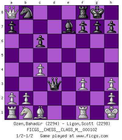 Last move : 1/2-1/2 2022 June 29 8:41:8 [Event "FICGS__CHESS__CLASS_M__000102"] [Site "FICGS"] [Date "2022.06.26"] [Round "1"] [White "Ozen,Bahadir"] [Black "Ligon,Scott"] [Result "1/2-1/2"] [WhiteElo "2294"] [BlackElo "2298"] 1.e4 e5 2.Nf3 Nf6 3.Nxe5 d6 4.Nf3 Nxe4 5.d4 d5 6.Bd3 Bd6 7.O-O O-O 8.c4 c6 9.Qb3 Bg4 10.Bxe4 dxe4 11.Ng5 Be7 12.Nxe4 Qxd4 13.Qxb7 Qxe4 14.Qxa8 Bh3 15.gxh3 Qg6+ 16.Kh1 Qe4+ 17.f3 Qd3 18.Kg2 Qg6+ 19.Kh1 Qd3 1/2-1/2 Petrov : Classical attack, Marshall variation Kingside Castling by player White (move 7) Kingside Castling by player Black (move 7) This chess game ended in a draw. Follow this game move after move (download)Avoid the crowd. Do your own thinking independently. Be the Chess player, not the Chess piece. (Ralph Charell) Ein Schachgenie ist jemand der verdammt gut Schach spielt. (Jonathan Levitt) Siempre es mejor sacrificar los hombres de tu oponente. (Savielly Tartakower) Le plus grand jeu de l'esprit jamais inventé, plus vous l'apprenez, plus vous y prenez du plaisir. (Garry Kasparov) Bobby never cared about money, though. His only desire was to prove that his choices were correct: He wanted chess to be important because he was a chess player, and he wanted to be important. Bobby knew money was important, but he didn't have a clue why, outside of clothes and status. The only way he could accomplish what he wanted was to fight for a lot of money. Once he got it, he gave it away. He did not know how to spend it. And once he'd become champion, after, essentially, sacrificing his life for it, he didn't know how to spend his time. (Bob Wade)
