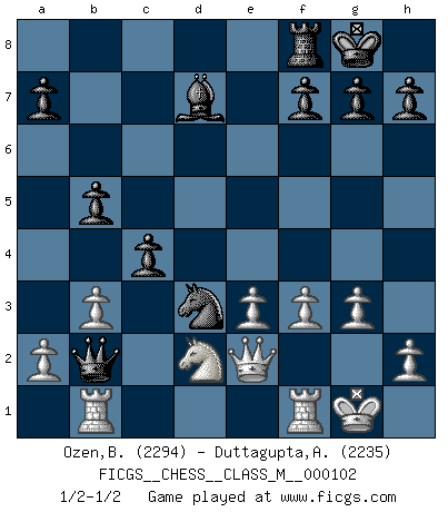 Last move : 1/2-1/2 2022 November 7 16:55:37 [Event "FICGS__CHESS__CLASS_M__000102"] [Site "FICGS"] [Date "2022.06.26"] [Round "1"] [White "Ozen,Bahadir"] [Black "Duttagupta,Aniruddha"] [Result "1/2-1/2"] [WhiteElo "2294"] [BlackElo "2235"] 1.d4 d5 2.c4 e6 3.Nf3 Nf6 4.g3 dxc4 5.Bg2 c6 6.Ne5 Bb4+ 7.Bd2 Be7 8.e3 b5 9.Nxc6 Nxc6 10.Bxc6+ Bd7 11.Bxa8 Qxa8 12.f3 e5 13.dxe5 Ng4 14.O-O Nxe5 15.Bc3 Nd3 16.Qe2 O-O 17.Bd4 Qc6 18.Nd2 Bf6 19.Bxf6 Qxf6 20.b3 Qb2 21.Rab1 1/2-1/2 Queen's gambit declined Kingside Castling by player White (move 14) Kingside Castling by player Black (move 16) This chess game ended in a draw. Follow this game move after move (download)A bad day of Chess is better than any good day at work. (Anonymous) Das Schachspiel hat wie die Liebe, die Musik, die Fähigkeit, den Menschen glücklich zu machen. Ich habe ein leises Gefühl des Bedauerns für jeden, der das Schachspiel nicht kennt, so wie ich jeden bedaure, der die Liebe nicht kennt. (Siegbert Tarrasch) El Ajedrez es un regaderazo frío para la mente. (Sir John Simon) L'attaque fait le spectacle, la défense gagne les matchs. (Dicton footballistique) Luck is the residue of design. (John Milton)