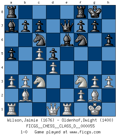 Last move : 1-0 2007 November 29 7:55:33 [Event "FICGS__CHESS__CLASS_D__000055"] [Site "FICGS"] [Date "2007.08.02"] [Round "1"] [White "Wilson,Jaimie"] [Black "Oldenhof,Dwight"] [Result "1-0"] [WhiteElo "1676"] [BlackElo "1400"] 1.c4 e5 2.Nc3 Nf6 3.Nf3 Nc6 4.g3 Bc5 5.Bg2 O-O 6.O-O Qe7 7.d3 h6 8.a3 a5 9.b3 d6 10.Bb2 Bg4 11.h3 Be6 12.e3 Bb6 13.d4 exd4 14.exd4 d5 15.c5 Ba7 16.Re1 1-0 This chess game has been lost on time (started : 2007.08.02 12:3:5) English Opening Kingside Castling by player Black (move 5) Kingside Castling by player White (move 6) Player White won this chess game. Follow this game move after move (download)On the chessboard, lies and hypocrisy do not survive long. (Emanuel Lasker) Wer mein Gambit spielt, muß bereit sein, alle Brücken hinter sich abzubrechen. Es verändert den ganzen Menschen. Es wirkt wie ein Zauberstab und fördert verkümmerte, gute Charakter- eigenschaften wieder zu Tage. (Emil Joseph Diemer) La batalla por la última verdad nunca sera ganada. Y es por eso que el Ajedrez es tan fascinante. (Hans Kmoch) Je crois qu'il existe des manières très spécifiques de jouer efficacement contre une machine. Evidemment, nous n'avons aucune chance en technique pure, parce que l'ordinateur calcule de manière parfaite. Mais lorsque nous faisons appel à notre cerveau, en utilisant l'intuition et la compréhension, alors nous restons beaucoup plus forts. (Anatoli Karpov) The production of too many useful things results in too many useless people. (Karl Marx)