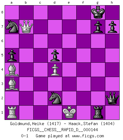 Last move : 0-1 2022 September 9 16:29:52 [Event "FICGS__CHESS__RAPID_D__000144"] [Site "FICGS"] [Date "2022.06.27"] [Round "1"] [White "Goldmund,Heike"] [Black "Haack,Stefan"] [Result "0-1"] [WhiteElo "1417"] [BlackElo "1404"] 1.b4 f5 2.Bb2 Nf6 3.Nf3 e6 4.a3 a5 5.b5 c6 6.e3 Be7 7.c4 O-O 8.d3 d5 9.Be2 Bd7 10.Ne5 cxb5 11.cxd5 exd5 12.Nxd7 Qxd7 13.O-O Nc6 14.Nd2 Rac8 15.d4 b4 16.axb4 Bxb4 17.Nf3 Ne4 18.Bb5 Qe6 19.h3 f4 20.Qd3 Na7 21.Ba4 Bc3 22.Ba3 Bxa1 23.Rxa1 fxe3 24.fxe3 Rc3 25.Qb1 Rxf3 26.gxf3 Nd2 27.Qxb7 Qxe3+ 28.Kh2 Qf2+ 29.Kh1 Qxf3+ 30.Kg1 Qg3+ 31.Kh1 Qxh3+ 32.Kg1 Rg3+ 33.Kf2 Qh2+ 34.Ke1 Rg1+ 0-1 Polish (Sokolsky) opening Kingside Castling by player Black (move 7) Kingside Castling by player White (move 13) Player Black won this chess game. Follow this game move after move (download)Pawn endings are to Chess what putting is to golf. (Cecil Purdy) Über Frauen: Chess is better. (Robert James Fischer) Bobby Fischer es el mas grande genio de Ajedrez de todos los tiempos. (Alexander Kotov) Je ne crois pas en la psychologie, je crois aux bons coups. (Robert Fischer) Two beer, or not two beer. (Unknown)