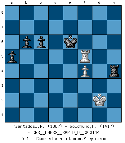 Last move : 0-1 2022 August 28 0:47:0 [Event "FICGS__CHESS__RAPID_D__000144"] [Site "FICGS"] [Date "2022.06.27"] [Round "1"] [White "Piantadosi,Angelo"] [Black "Goldmund,Heike"] [Result "0-1"] [WhiteElo "1387"] [BlackElo "1417"] 1.e4 d5 2.exd5 Qxd5 3.Nc3 Qa5 4.d4 Nf6 5.Bd2 c6 6.Ne4 Qc7 7.Nxf6+ gxf6 8.Nf3 Bg4 9.Be2 Nd7 10.O-O O-O-O 11.h3 Bf5 12.Bd3 Bxd3 13.cxd3 e6 14.Re1 Nb6 15.Rc1 Nd5 16.b4 Nxb4 17.Bxb4 Bxb4 18.Re2 Bd6 19.Nd2 Bf4 20.Rc2 Rxd4 21.Nf3 Rd5 22.Qb1 Rxd3 23.Rb2 Rhd8 24.Re1 Bd2 25.Nxd2 Rxd2 26.Rxd2 Rxd2 27.Qxh7 b6 28.Qh8+ Kb7 29.Qxf6 Rxa2 30.h4 Ra5 31.g4 Ra4 32.Qg7 f5 33.Qxc7+ Kxc7 34.gxf5 exf5 35.Re5 Rxh4 36.Rxf5 a5 37.f4 Kd6 38.Kg2 Ke6 0-1 Scandinavian (centre counter) defense Kingside Castling by player White (move 10) Queenside Castling by player Black (move 10) 10 pieces endgame at move 34 : White KRPP , Black KRPPPP WHITE : King + 1 Rook 2 Pawns BLACK : King + 1 Rook 4 Pawns 9 pieces endgame at move 35 : White KRP , Black KRPPPP WHITE : King + 1 Rook 1 Pawn BLACK : King + 1 Rook 4 Pawns 8 pieces endgame at move 36 : White KRP , Black KRPPP WHITE : King + 1 Rook 1 Pawn BLACK : King + 1 Rook 3 Pawns Player Black won this chess game. Follow this game move after move (download)Pawns are born free, yet they are everywhere in chains. (Rick Kennedy) Im Schach gibt es keinen Platz für Galanterie. (Irving Chernev) Durante una competencia de Ajedrez, un Maestro de Ajedrez deberá ser una combinación de presa de caza y un Monge. (Alexander Alekhine) L'action d'une oeuvre littéraire se déroule sur un champ de bataille. Les masques et les types du drame moderne correspondent aux pièces du jeu d'échecs. L'intrigue correspond aux coups et aux gambits, c'est à dire aux techniques du jeu telles qu'utilisées et interprétées par les joueurs. Les tactiques et les péripéties [mouvements] correspondent aux coups exécutés par l'adversaire. (Viktor Shklovsky) Creativity involves breaking out of established patterns in order to look at things in a different way. (Edward De Bono)