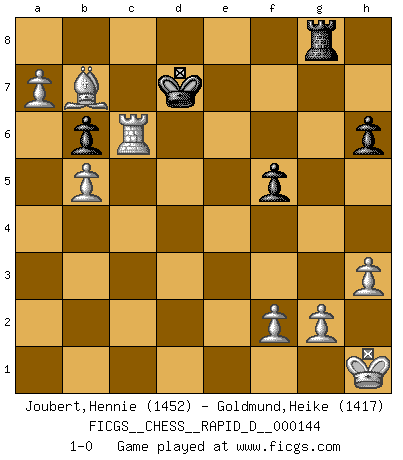 Last move : 1-0 2022 August 31 17:17:58 [Event "FICGS__CHESS__RAPID_D__000144"] [Site "FICGS"] [Date "2022.06.27"] [Round "1"] [White "Joubert,Hennie"] [Black "Goldmund,Heike"] [Result "1-0"] [WhiteElo "1452"] [BlackElo "1417"] 1.e4 d5 2.exd5 Qxd5 3.Nc3 Qa5 4.d4 Nf6 5.Nf3 Bg4 6.Be2 c6 7.O-O e6 8.Bd2 Nbd7 9.Ne4 Qc7 10.Nxf6+ Nxf6 11.h3 Bh5 12.c3 Ne4 13.Be3 Bd6 14.Qd3 Nf6 15.Bg5 Bg6 16.Qc4 O-O-O 17.a4 h6 18.Bxf6 gxf6 19.Rfe1 Rhg8 20.Kh1 Be4 21.a5 Bd5 22.Qd3 f5 23.a6 b6 24.c4 Be4 25.Qc3 Bxf3 26.Bxf3 Bf4 27.b4 Qd6 28.Rad1 Bg5 29.c5 Qc7 30.b5 Bf6 31.Bxc6 Bxd4 32.Rxd4 e5 33.Rxd8+ Qxd8 34.Bb7+ Kb8 35.Qxe5+ Qc7 36.Qxc7+ Kxc7 37.cxb6+ axb6 38.Re7+ Kd6 39.Rxf7 Ke6 40.Rc7 Kd6 41.Rc6+ Kd7 42.a7 1-0 Scandinavian (centre counter) defense Kingside Castling by player White (move 7) Queenside Castling by player Black (move 16) Player White won this chess game. Follow this game move after move (download)For surely of all the drugs in the world, Chess must be the most permanently pleasurable. (Assiac) Nur ein wirklich starker Spieler weiß wie schwach er spielt. (Savielly Grigorievitsch Tartakower) Es el objetivo de la escuela moderna no tratar cada posición de acuerdo a una regla general, sino de acuerdo al principio inherente en la posición. (Richard Reti) Plusieurs personnes se sont demandées comment Tal faisait pour gagner... En fait, c'est très simple ! Il met ses pièces au centre de l'échiquier et les sacrifie quelque part ! (David Bronstein) Memory... is the diary that we all carry with us. (Oscar Wilde, The Importance of Being Earnest)