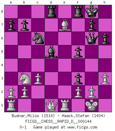 Last move : 0-1 2022 August 17 7:29:39 [Event "FICGS__CHESS__RAPID_D__000144"] [Site "FICGS"] [Date "2022.06.27"] [Round "1"] [White "Budnar,Milos"] [Black "Haack,Stefan"] [Result "0-1"] [WhiteElo "1514"] [BlackElo "1404"] 1.e4 c5 2.Nf3 Nc6 3.d4 cxd4 4.Nxd4 e5 5.Nf3 Nf6 6.Bd3 d5 7.Nbd2 Be7 8.O-O O-O 9.h3 h6 10.c3 Be6 11.exd5 Nxd5 12.Be4 f5 13.Bxd5 Bxd5 14.Nb3 Qd6 15.Re1 Rad8 16.Be3 Qg6 17.Bc5 e4 18.Bxe7 exf3 0-1 Sicilian : Labourdonnais-Loewenthal variation Kingside Castling by player White (move 8) Kingside Castling by player Black (move 8) Player Black won this chess game. Follow this game move after move (download)The isolated Pawn casts gloom over the entire chessboard. (Aaron Nimzovich) Ich verstehe Aljechins Kombinationen ganz gut; aber woher er diese Angriffschancen bekommt und wie er die Eröffnung behandelt das ist für mich ein Buch mit sieben Siegeln. (Rudolf Spielmann) Observen a Garry Kasparov. Después de una derrota, invariablemente el gana la próxima partida. Prácticamente hace pedazos a su siguiente oponente. Eso es algo que tenemos que aprender a lograr. (Maurice Ashley) Il n'y a pas eu de défaite parce que je ne crois pas que cet ordinateur ait jamais existé. IBM a triché en refusant d'imprimer les modes de recherche de la machine. C'est évident, pendant le match, des coups décisifs ont été joués par des êtres humains. Aujourd'hui, les meilleurs spécialistes en informatique ne peuvent toujours pas expliquer comment Deep-Blue a pu jouer contre la logique des ordinateurs. IBM a gagné une guerre de communication, mais ils sont incapables de prouver que l'ordinateur a gagné tout seul. (Garry Kasparov) The greatest con, that he ever pulled... was making you believe... that he is you. (Revolver, movie)