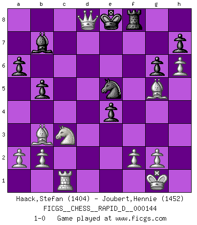 Last move : 1-0 2022 September 26 19:50:56 [Event "FICGS__CHESS__RAPID_D__000144"] [Site "FICGS"] [Date "2022.06.27"] [Round "1"] [White "Haack,Stefan"] [Black "Joubert,Hennie"] [Result "1-0"] [WhiteElo "1404"] [BlackElo "1452"] 1.d4 d5 2.Nf3 g6 3.c4 dxc4 4.Nc3 Bg7 5.e4 e6 6.Bxc4 Ne7 7.O-O O-O 8.Be3 c6 9.Qd2 b5 10.Bd3 Bb7 11.h4 Nd7 12.Rac1 a6 13.h5 f5 14.Rfd1 c5 15.h6 Bf6 16.dxc5 Rc8 17.Bc2 Rc7 18.Bb3 Kf7 19.Qd6 fxe4 20.Qxe6+ Ke8 21.Ng5 Rc6 22.Rd6 Rxd6 23.cxd6 Bxg5 24.Bxg5 Nc5 25.Qe5 Nd3 26.dxe7 Nxe5 27.exd8Q+ 1-0 Queen's pawn game Kingside Castling by player White (move 7) Kingside Castling by player Black (move 7) Promotion Queen by player White (move 27) Player White won this chess game. Follow this game move after move (download)Good offense and good defense both begin with good development. (Bruce A. Moon) Die Neutralität betrachte ich als eine schwere Krankheit. (Viktor Kortschnoi) La partida mas dura de ganar es una partida ganada. (Emanuel Lasker) On est toujours la mazette de quelqu'un d'autre. (Anonyme) Luck has a peculiar habit of favoring those who don't depend on it. (Author unknown)