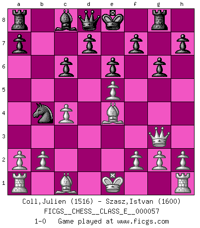 Last move : 1-0 2007 October 16 0:49:36 [Event "FICGS__CHESS__CLASS_E__000057"] [Site "FICGS"] [Date "2007.08.02"] [Round "1"] [White "Coll,Julien"] [Black "Szasz,Istvan"] [Result "1-0"] [WhiteElo "1516"] [BlackElo "1600"] 1.e4 c5 2.Nf3 Nc6 3.d4 cxd4 4.Nxd4 e6 5.Nc3 Bb4 6.Nxc6 bxc6 7.Qd4 Bxc3+ 8.Qxc3 Nf6 9.e5 Nd5 10.Qg3 Rg8 11.Bd3 g6 12.c4 Nb4 13.Be4 1-0 Sicilian defense Player White won this chess game. Follow this game move after move (download)You may learn much more from a game you lose than from a game you win. You will have to lose hundreds of games before becoming a good player. (Jose Raul Capablanca) Im Schach gewinnt jeder. Hat man Freunde am Spiel - und das ist die Hauptsache - ist auch der Verlust einer Partie kein Unglück. (David Bronstein) Aún deseo matar a Fischer. (Boris Spassky) Le succès, c'est être capable d'aller d'échec en échec sans perdre son enthousiasme. (Winston Churchill) The difference between perseverance and obstinacy is that one comes from a strong will, and the other from a strong won't. (Henry Ward Beecher)
