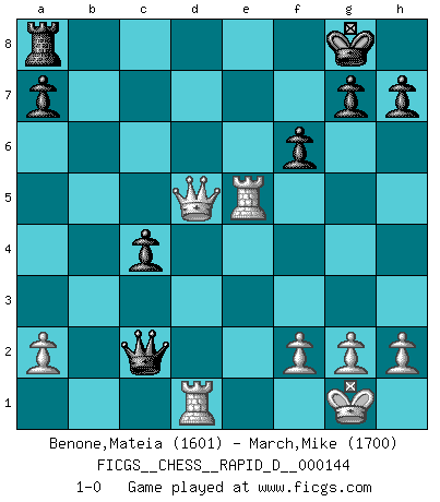 Last move : 1-0 2022 July 20 13:14:1 [Event "FICGS__CHESS__RAPID_D__000144"] [Site "FICGS"] [Date "2022.06.27"] [Round "1"] [White "Benone,Mateia"] [Black "March,Mike"] [Result "1-0"] [WhiteElo "1601"] [BlackElo "1700"] 1.e4 e6 2.d4 d5 3.e5 Ne7 4.Nf3 Nf5 5.Bd3 c5 6.Bxf5 exf5 7.c3 Nc6 8.O-O Be7 9.dxc5 Bxc5 10.Nbd2 O-O 11.Nb3 b6 12.Nxc5 bxc5 13.Be3 c4 14.Re1 Re8 15.Bc5 f4 16.Bd6 Bg4 17.Qxd5 Bxf3 18.Qxf3 Qb6 19.Rad1 Nxe5 20.Bxe5 Qxb2 21.Qg4 Rxe5 22.Rxe5 Qxc3 23.Qxf4 Qc2 24.Qd4 f6 25.Qd5+ 1-0 French : Advance variation Kingside Castling by player White (move 8) Kingside Castling by player Black (move 10) Player White won this chess game. Follow this game move after move (download)Checkers is for tramps. (Paul Morphy) Ein typischer, sehr verbreiteter Gedankenschädling ist der, daß der betreffende Amateur von der Annanhme ausgeht, daß jeder einzelne Zug etwas zu leisten habe. (Aaron Nimzowitsch) El hombre es un frívolo, una creatura engañosa y como un jugador de Ajedrez, se preocupa mas por el proceso de obtener su meta que de la meta por sí misma. (Dostoyevsky) Des idées, des idées, j'en ai cent, j'en ai mille. Des bonnes, des mauvaises, applicables, irréalisables... Il suffit de faire le tri ! (Roos) Life is pain my dear and anyone who says otherwise is selling something. (Princess Bride)