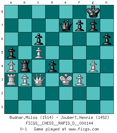 Last move : 0-1 2022 August 16 14:48:35 [Event "FICGS__CHESS__RAPID_D__000144"] [Site "FICGS"] [Date "2022.06.27"] [Round "1"] [White "Budnar,Milos"] [Black "Joubert,Hennie"] [Result "0-1"] [WhiteElo "1514"] [BlackElo "1452"] 1.e4 c5 2.Nf3 e6 3.d4 cxd4 4.Qxd4 Nc6 5.Qa4 d6 6.Bb5 Bd7 7.O-O Nf6 8.Nc3 Be7 9.h3 a6 10.Bxc6 Bxc6 11.Qb3 Nxe4 12.Nxe4 Bxe4 13.Bg5 Bxg5 14.Nxg5 Bd5 15.Qd3 h6 16.Nf3 O-O 17.c4 Bc6 18.Rfd1 d5 19.Ne5 Qc7 20.Nxc6 bxc6 21.c5 Rfb8 22.b3 a5 23.a4 Rb4 24.Rdc1 Rab8 25.Ra3 e5 26.f3 Qd7 27.g4 Qb7 28.Rb1 Rd4 29.Qc3 Qa6 30.Kf2 R8b4 31.Ke3 Qb7 32.Rb2 Qe7 33.Rd2 Rxg4 34.hxg4 d4+ 35.Rxd4 exd4+ 0-1 Sicilian defense Kingside Castling by player White (move 7) Kingside Castling by player Black (move 16) Player Black won this chess game. Follow this game move after move (download)The sign of a great Master is his ability to win a won game quickly and painlessly. (Irving Chernev) Der 70jährige Viktor Kortschnoi: Die Rentenanstalt wollte mich zwingen in Rente zu gehen. Meine Frau erhält jetzt eine Pension- und ich zahle weiter in die Rentenkasse ein! (Viktor Kortschnoi) Siempre es mejor sacrificar los hombres de tu oponente. (Savielly Tartakower) À la honte des hommes, on sait que les lois du jeu sont les seules qui soient partout justes, claires, inviolables et exécutées. Pourquoi l'Indien qui a donné les règles du jeu d'échecs est-il obéi de bon gré dans toute la terre, et que les décrétales des papes, par exemple, sont aujourd'hui un objet d'horreur et de mépris ? C'est que l'inventeur des échecs combina tout avec justesse pour la satisfaction des joueurs, et que les papes, dans leurs décrétales, n'eurent en vue que leur seul avantage. L'Indien voulut exercer également l'esprit des hommes et leur donner du plaisir; les papes ont voulu abrutir l'esprit des hommes. Voltaire (Dictionnaire philosophique / Garnier 1967) The problem with manipulation is that people can turn on you. (Horatio Caine, C.S.I. Miami)