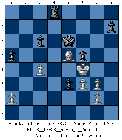 Last move : 0-1 2022 August 13 22:5:37 [Event "FICGS__CHESS__RAPID_D__000144"] [Site "FICGS"] [Date "2022.06.27"] [Round "1"] [White "Piantadosi,Angelo"] [Black "March,Mike"] [Result "0-1"] [WhiteElo "1387"] [BlackElo "1700"] 1.e4 e6 2.d4 d5 3.Nc3 Nf6 4.e5 Ne4 5.Nxe4 dxe4 6.Ne2 c5 7.Be3 cxd4 8.Nxd4 Nc6 9.Bb5 Bd7 10.Nxc6 Bxc6 11.Bxc6+ bxc6 12.Qxd8+ Rxd8 13.O-O Rd5 14.Bf4 f6 15.exf6 gxf6 16.Rad1 Bg7 17.c4 Rxd1 18.Rxd1 O-O 19.Kf1 f5 20.Ke2 Bxb2 21.Rd6 e5 22.Bh6 Rc8 23.Rd7 a5 24.Rg7+ Kh8 25.Rg5 Bc1 26.Bg7+ Kg8 27.Rg3 Bf4 28.Bxe5 Bxg3 29.hxg3 Kf7 30.Ke3 Ke6 31.Kf4 Rd8 32.f3 e3 0-1 French : Steinitz variation Kingside Castling by player White (move 13) Kingside Castling by player Black (move 18) Player Black won this chess game. Follow this game move after move (download)Even the laziest King flees wildly in the face of a double check ! (Aaron Nimzowitsch) Je älter ich werde, um so mehr schätze ich die Bauern. (Paul Keres) Botvinnik trataba de restarle el misterio al Ajedrez, siempre relacionandolo a situaciones de la vida ordinaria. El gustaba de llamar al Ajedrez un típico problema inexacto similar a aquellos de los cuales la gente siempre tiene que enfrentarse en la vida cotidiana. (Garry Kasparov) Les sacrifices démontrent seulement que quelqu'un a gaffé. (Savielly Tartacover) The human is the only animal species whose members are able to talk themselves into difficulties that would not otherwise exist. (Wendell Johnson)