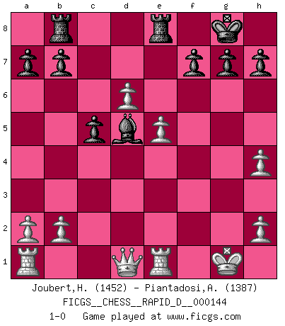 Last move : 1-0 2022 August 11 23:43:51 [Event "FICGS__CHESS__RAPID_D__000144"] [Site "FICGS"] [Date "2022.06.27"] [Round "1"] [White "Joubert,Hennie"] [Black "Piantadosi,Angelo"] [Result "1-0"] [WhiteElo "1452"] [BlackElo "1387"] 1.e4 Nf6 2.e5 Nd5 3.d4 d6 4.c4 Nb6 5.f4 dxe5 6.fxe5 e6 7.Be3 N8d7 8.Nf3 Be7 9.Nc3 O-O 10.Be2 c5 11.d5 exd5 12.cxd5 Re8 13.O-O Nf8 14.Bf4 Ng6 15.Bg3 Nh4 16.d6 Nxf3+ 17.Bxf3 Bh4 18.Bxh4 Qxh4 19.Re1 Rb8 20.Nd5 Nxd5 21.Bxd5 Be6 22.g3 Bxd5 23.gxh4 1-0 Alekhine's defense : Four pawns attack Kingside Castling by player Black (move 9) Kingside Castling by player White (move 13) Player White won this chess game. Follow this game move after move (download)Fischer was a master of clarity and a king of artful positioning. His opponents would see where he was going but were powerless to stop him. (Bruce Pandolfini) Wenn ein Kopf und ein Buch zusammenstoßen und es klingt hohl, ist es denn allemal im Buche? (Georg Christoph Lichtenberg) El Ajedrez es el arte del análisis. (Mikhail Botvinnik) On n'a jamais que l'âge auquel on a commence à jouer aux échecs car après on cesse de vieillir. (Capablanca) Looking at the proliferation of personal web pages on the Net, it looks like very soon everyone on Earth will have 15 megabytes of fame. (M.G. Sriram)