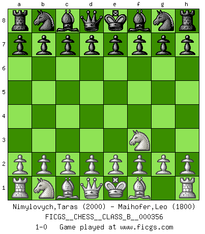 Last move : 1-0 2022 August 13 3:13:18 [Event "FICGS__CHESS__CLASS_B__000356"] [Site "FICGS"] [Date "2022.07.02"] [Round "1"] [White "Nimylovych,Taras"] [Black "Maihofer,Leo"] [Result "1-0"] [WhiteElo "2000"] [BlackElo "1800"] 1.Nf3 1-0 This chess game has been lost on time (started : 2022.07.02 20:38:33) Reti Opening Player White won this chess game. Follow this game move after move (download)When you are lonely, when you feel yourself an alien in the world, play Chess. This will raise your spirits and be your counselor in war. (Aristotle) Schach ist Leben. (Robert James Fischer) El arma más poderosa en el Ajedrez, es tener la próxima movida. (David Bronstein) Les erreurs sont comme les malheurs, elles n'arrivent jamais seules. (Siegbert Tarrasch) Home computers are being called upon to perform many new functions, including the consumption of homework formerly eaten by the dog. (Doug Larson)