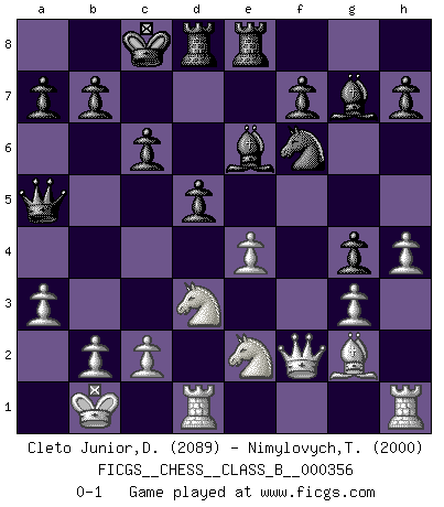 Last move : 0-1 2022 August 7 13:26:42 [Event "FICGS__CHESS__CLASS_B__000356"] [Site "FICGS"] [Date "2022.07.02"] [Round "1"] [White "Cleto Junior,Dirceu"] [Black "Nimylovych,Taras"] [Result "0-1"] [WhiteElo "2089"] [BlackElo "2000"] 1.e4 e5 2.f4 exf4 3.Nf3 d6 4.d4 g5 5.Qd3 Nc6 6.Nc3 Bg7 7.h4 g4 8.Ng1 Nxd4 9.Bxf4 Ne6 10.Nge2 Nxf4 11.Nxf4 c6 12.O-O-O Be5 13.Qd2 Be6 14.g3 Qe7 15.Qe1 O-O-O 16.Nd3 Bg7 17.Bg2 Qc7 18.Ne2 Nf6 19.Kb1 Rhe8 20.Qf2 Qa5 21.a3 d5 0-1 KGA : Fischer defense Queenside Castling by player White (move 12) Queenside Castling by player Black (move 15) Player Black won this chess game. Follow this game move after move (download)Chess is ruthless: you've got to be prepared to kill people. (Nigel Short) Spiel ein langweiliges Spiel zu Ende und lustige Dinge können passieren. (Hans Ree) El Ajedrez tiene tanto misterio como las mujeres. (Purdy) Echiquier : carré parfait, comme la Jérusalem nouvelle décrite par l'auteur de l'Apocalypse, huit cases sur huit, exaltation du chiffre 4, symbole du cosmos aux quatre horizons... où le noir et le blanc, l'ombre et la lumière, le mal et le bien s'entremêlent et se conjuguent. (Robert Couffignal, Le Gambit du poète) For peace of mind, resign as general manager of the universe. (Douglas Adams)