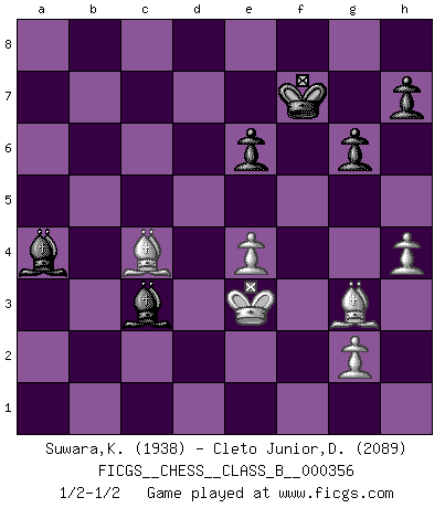 Last move : 1/2-1/2 2022 August 31 12:2:6 [Event "FICGS__CHESS__CLASS_B__000356"] [Site "FICGS"] [Date "2022.07.02"] [Round "1"] [White "Suwara,Kazimierz"] [Black "Cleto Junior,Dirceu"] [Result "1/2-1/2"] [WhiteElo "1938"] [BlackElo "2089"] 1.d4 d5 2.Nf3 Nf6 3.Bg5 Ne4 4.Bh4 c5 5.e3 Qb6 6.Nc3 Qa5 7.Be2 Nc6 8.O-O Nxc3 9.bxc3 Qxc3 10.dxc5 e6 11.Rb1 a6 12.Nd4 Bxc5 13.Nxc6 bxc6 14.Rb3 Qa5 15.Qa1 O-O 16.Qc3 Qxc3 17.Rxc3 Bb4 18.Rxc6 Bd7 19.Rxa6 Rxa6 20.Bxa6 Ra8 21.Bd3 Rxa2 22.Rb1 Ra4 23.Bg3 f6 24.h4 g6 25.c4 dxc4 26.Bxc4 Be7 27.Be2 Rb4 28.Rxb4 Bxb4 29.e4 Bc6 30.f3 Bc3 31.Bc4 Kf7 32.Kf2 f5 33.Ke3 fxe4 34.fxe4 Ba4 1/2-1/2 Torre attack (Tartakower variation) Kingside Castling by player White (move 8) Kingside Castling by player Black (move 15) This chess game ended in a draw. Follow this game move after move (download)Don't even mention losing to me. I can't stand to think of it. (Bobby Fischer) Ich glaube, ich kenne inzwischen die Gründe für mein Versagen: schachliche Charakterfehler. Ich war nie ein Wunderkind und in meiner gesamten menschlichen Entwicklung immer zu langsam. (Viktor Kortschnoi) El Ajedrez es imaginación. (David Bronstein) Seul un grand joueur sait à quel point il joue faiblement. (Xavier Tartacover) Control your own destiny or someone else will. (Jack Welch)