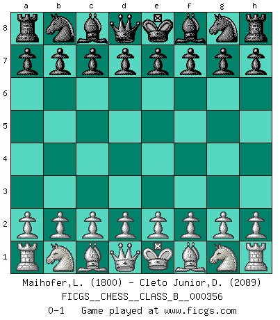 Last move : 0-1 2022 August 12 2:10:51 [Event "FICGS__CHESS__CLASS_B__000356"] [Site "FICGS"] [Date "2022.07.02"] [Round "1"] [White "Maihofer,Leo"] [Black "Cleto Junior,Dirceu"] [Result "0-1"] [WhiteElo "1800"] [BlackElo "2089"] 0-1 This chess game has been lost on time (started : 2022.07.02 20:38:33) Player Black won this chess game. Follow this game move after move (download)Chess is life. (Bobby Fischer) Immer nach dem besten Zug zu suchen ist ziemlich unpraktisch. (Nigel Short) Buenas posiciones no logran ganar juegos, buenas movidas sí. (Gerald Abrahams) Si rien de grave n'est détecté lors de l'analyse d'une position, on joue alors le coup. Seconde règle de Blumenfeld. Everything in life is luck. (Donald Trump)