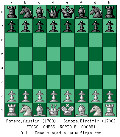 Last move : 0-1 2022 August 2 3:7:15 [Event "FICGS__CHESS__RAPID_B__000381"] [Site "FICGS"] [Date "2022.07.03"] [Round "1"] [White "Romero,Agustin"] [Black "Simoza,Bladimir"] [Result "0-1"] [WhiteElo "1700"] [BlackElo "1700"] 0-1 This chess game has been lost on time (started : 2022.07.03 2:18:10) Player Black won this chess game. Follow this game move after move (download)You sit at the board and suddenly your heart leaps. Your hand trembles to pick up the piece and move it. But what Chess teaches you is that you must sit there calmly and think about whether it's really a good idea and whether there are other better ideas. (Stanley Kubrick) Moralische Siege zählen nicht. (Savielly Grigorievitsch Tartakower) El ganador de una partida es aquel jugador que hace el penúltimo error. (Savielly Tartakover) Ce n'est pas pour s'amuser qu'il joue aux échecs : il célèbre un culte. (Vladimir Nabokov) Rules and bones are meant to be broken. (Anonymous)