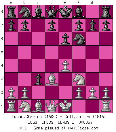 Last move : 0-1 2007 September 16 14:43:2 [Event "FICGS__CHESS__CLASS_E__000057"] [Site "FICGS"] [Date "2007.08.02"] [Round "1"] [White "Lucas,Charles"] [Black "Coll,Julien"] [Result "0-1"] [WhiteElo "1600"] [BlackElo "1516"] 1.e4 c5 2.Nf3 e6 3.d4 cxd4 4.c3 Nf6 5.Bd3 dxc3 0-1 This chess game has been lost on time (started : 2007.08.02 12:3:17) Sicilian defense Player Black won this chess game. Follow this game move after move (download)Suddenly it was obvious to me in my analysis I had missed what Fischer had found with the greatest of ease at the board. (Mikhail Botvinnik) Intelligenz läßt sich nicht am Weg, sondern nur am Ergebnis feststellen. (Garry Kasparov) No nos podemos resistir a la fascinación de un sacrificio ya que la pasión por los sacrificios es parte de la naturaleza de un jugador de Ajedrez. (Rudolf Spielman) Les pièces de l'échiquier étaient impitoyables. Elles le retenaient, elles l'absorbaient. Il y avait de l'horreur en cela, mais aussi une harmonie unique. Car, qu'y a-t-il dans le monde, à part les échecs ? (V. Nabokov) When you stop learning you start dying. (Scott Adams)