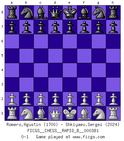 Last move : 0-1 2022 August 2 3:7:15 [Event "FICGS__CHESS__RAPID_B__000381"] [Site "FICGS"] [Date "2022.07.03"] [Round "1"] [White "Romero,Agustin"] [Black "Shklyaev,Sergei"] [Result "0-1"] [WhiteElo "1700"] [BlackElo "2024"] 0-1 This chess game has been lost on time (started : 2022.07.03 2:18:10) Player Black won this chess game. Follow this game move after move (download)I guess a certain amount of temperament is expected of Chess geniuses. (Ron Gross) Mit sehr nachdenklichem Gesicht schreitet Bobby durch den Turniersaal. Was ist passiert?, fragt Lombardy. Ich stehe schlecht, antwortet Fischer. Lombardy: Dann biete doch einfach Remis an. Fischer: So schlecht stehe ich nun auch wieder nicht! (Robert James Fischer) Un sacrificio se refuta mucho mejor al aceptarlo. (Wilhelm Steinitz) Avec des compensations pour le matériel en plus... (Anonyme) What doesn't kill us makes us stronger. (Friedrich Nietzsche)