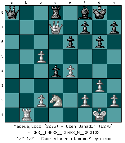 Last move : 1/2-1/2 2022 August 25 5:57:0 [Event "FICGS__CHESS__CLASS_M__000103"] [Site "FICGS"] [Date "2022.07.04"] [Round "1"] [White "Maceda,Coco"] [Black "Ozen,Bahadir"] [Result "1/2-1/2"] [WhiteElo "2276"] [BlackElo "2276"] 1.Nf3 d5 2.d4 Nf6 3.Bf4 c5 4.e3 Nc6 5.Nbd2 Qb6 6.dxc5 Qxb2 7.Rb1 Qc3 8.Bb5 g6 9.e4 a6 10.Bxc6+ bxc6 11.Be3 Bg4 12.Rb3 Bxf3 13.Qxf3 Qa1+ 14.Rb1 Qxa2 15.Qf4 Qa5 16.Rb8+ Rxb8 17.Qxb8+ Qd8 18.Qb7 Bg7 19.Qxc6+ Qd7 20.Qa8+ Qd8 21.Qxa6 O-O 22.O-O Ng4 23.Qe2 Nxe3 24.Qxe3 Qa8 25.Rb1 Rc8 26.g3 d4 27.Qg5 e6 28.Qe7 Bf8 29.Qd7 Rd8 30.Qb5 Rc8 31.Qd7 Rd8 1/2-1/2 Reti Opening Kingside Castling by player Black (move 21) Kingside Castling by player White (move 22) This chess game ended in a draw. Follow this game move after move (download)In the perfect Chess combination as in a first-rate short story, the whole plot and counter-plot should lead up to a striking finale, the interest not being allayed until the very last moment. (Yates and Winter) Ich bin Weltmeister und muß mit niemandem irgend etwas diskutieren. (Viswanathan Anand) Por la belleza de sus partidas, la claridad de su juego y lo brillante de sus ideas, Fischer se creó el mismo como un artista de la misma estatura como Brahms, Rembrandt y Shakespeare. (David Levy) RxDa4 pat (...) When you have everything, sometimes it feels like nothing. (Horatio Caine, C.S.I. Miami)