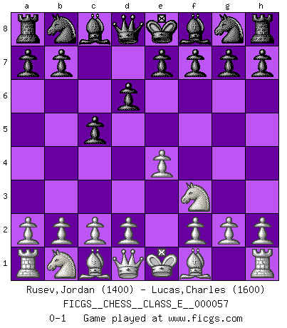 Last move : 0-1 2007 September 24 21:50:10 [Event "FICGS__CHESS__CLASS_E__000057"] [Site "FICGS"] [Date "2007.08.02"] [Round "1"] [White "Rusev,Jordan"] [Black "Lucas,Charles"] [Result "0-1"] [WhiteElo "1400"] [BlackElo "1600"] 1.e4 c5 2.Nf3 d6 0-1 This chess game has been lost on time (started : 2007.08.02 12:3:17) Sicilian Player Black won this chess game. Follow this game move after move (download)One doesn't have to play well, it's enough to play better than your opponent. (Siegbert Tarrasch) Bis zum Jahr 1971 verlief in meiner Schachkariere alles glatt. Dieses dramatische Match [Fischer-Taimanov 6:0] machte mein Leben zur Hölle. (Mark Taimanov) Hasta este punto, las blancas han seguido un análisis bien conocido. Pero ahora el hace un error fatal: empieza a usar su propia cabeza. (Siegbert Tarrasch) Le thème de l'attaque double intervient d'une manière ou d'une autre dans l'immense majorité des combinaisons. (Youri Averbakh) In God we trust, all others we virus scan. (Anonymous)