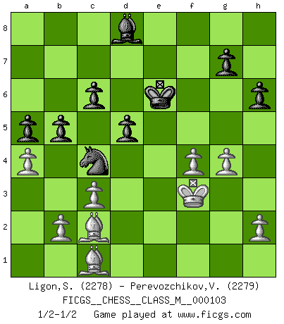 Last move : 1/2-1/2 2022 July 24 0:32:15 [Event "FICGS__CHESS__CLASS_M__000103"] [Site "FICGS"] [Date "2022.07.04"] [Round "1"] [White "Ligon,Scott"] [Black "Perevozchikov,Vjacheslav"] [Result "1/2-1/2"] [WhiteElo "2278"] [BlackElo "2279"] 1.e4 e6 2.d4 d5 3.exd5 exd5 4.Nf3 Nf6 5.Bd3 Bd6 6.Qe2+ Be6 7.Ng5 Qe7 8.Nxe6 fxe6 9.c3 O-O 10.O-O e5 11.dxe5 Qxe5 12.Qxe5 Bxe5 13.Nd2 Nbd7 14.Nf3 Bd6 15.g3 a5 16.a4 Rae8 17.Kg2 c6 18.Nd4 Nc5 19.Bc2 Rf7 20.Nf5 Bc7 21.Be3 Nce4 22.f3 Nd6 23.Rae1 Nxf5 24.Bxf5 Rfe7 25.Bd2 Kf7 26.Rxe7+ Rxe7 27.Re1 Rxe1 28.Bxe1 Ne8 29.Bc2 Nd6 30.Bf2 b5 31.f4 h6 32.Kf3 Bd8 33.g4 Ke6 34.Be3 Nc4 35.Bc1 1/2-1/2 French : Exchange variation Kingside Castling by player Black (move 9) Kingside Castling by player White (move 10) This chess game ended in a draw. Follow this game move after move (download)You have to have the fighting spirit. You have to force moves and take chances. (Bobby Fischer) Ein Isolani verdüstert die Stimmung auf dem ganzen Schachbrett. (Savielly Grigorievitsch Tartakower) El Ajedrez es el juego mas altamente simbólico, pero las agresiones estan por lo tanto aún mas francamente representadas en la partida. Tal vez comenzo como un juego de guerra; Algo como la representación de una batalla en miniatura entre las fuerzas de dos reinos. (Karl Meninger) Il vaut toujours mieux jouer un plan faux de façon logique que de n'avoir pas de plan du tout. (Victor Kortchnoï) There are two major products that came out of Berkeley: LSD and UNIX. We do not believe this is to be a coincidence. (Jeremy S. Anderson)