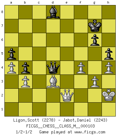 Last move : 1/2-1/2 2023 February 9 13:0:36 [Event "FICGS__CHESS__CLASS_M__000103"] [Site "FICGS"] [Date "2022.07.04"] [Round "1"] [White "Ligon,Scott"] [Black "Jabot,Daniel"] [Result "1/2-1/2"] [WhiteElo "2278"] [BlackElo "2243"] 1.e4 c5 2.d4 cxd4 3.c3 dxc3 4.Nxc3 Nc6 5.Nf3 d6 6.Bc4 e6 7.O-O Be7 8.Qe2 Nf6 9.Rd1 e5 10.Bb5 Bg4 11.h3 Bxf3 12.Qxf3 O-O 13.Be3 a6 14.Be2 Rc8 15.h4 h5 16.g3 g6 17.Bf1 Qd7 18.Rd3 Kg7 19.Rad1 b5 20.Qh1 Qb7 21.Bh3 Rc7 22.Qf3 Rb8 23.Kh2 Rd8 24.R3d2 Kg8 25.a3 Kg7 26.Kg1 Nd4 27.Rxd4 exd4 28.Bxd4 Rc4 29.Qe3 Re8 30.Nd5 Bd8 31.Bg2 Qd7 32.b3 Rxd4 33.Qxd4 Qe6 34.Rc1 a5 35.Rc6 Kh7 36.Nxf6+ Qxf6 37.Qd5 Re6 38.f4 Kg7 39.Kh2 Qb2 40.Rxd6 Rxd6 41.Qxd6 Qf6 42.Qd7 b4 43.a4 Qe7 44.Qd4+ Qf6 45.e5 Qb6 46.Qd7 Qc7 47.Qd5 Be7 48.e6 fxe6 49.Qxe6 Qd6 50.Qe2 Bd8 51.Be4 Qd4 52.Bd3 1/2-1/2 Sicilian : Smith-Morra gambit Kingside Castling by player White (move 7) Kingside Castling by player Black (move 12) This chess game ended in a draw. Follow this game move after move (download)Spassky will not be psyched out by Fischer. (Mike Goodall) Ich liebe den Moment, wenn ich das Ego meines Gegenüber breche. (Robert James Fischer) Fischer es el jugador mas fuerte del mundo. De hecho, el jugador mas fuerte que jamas haya existido. (Larry Evans) Les échecs, c'est l'imagination. (David Bronstein) The existence of forgetting has never been proved: We only know that some things don't come to mind when we want them. (Friedrich Nietzsche)