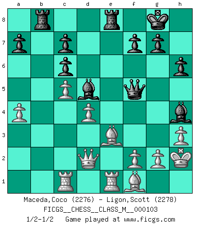 Last move : 1/2-1/2 2022 July 20 22:55:39 [Event "FICGS__CHESS__CLASS_M__000103"] [Site "FICGS"] [Date "2022.07.04"] [Round "1"] [White "Maceda,Coco"] [Black "Ligon,Scott"] [Result "1/2-1/2"] [WhiteElo "2276"] [BlackElo "2278"] 1.e4 e5 2.Nf3 Nf6 3.Nxe5 d6 4.Nf3 Nxe4 5.d4 d5 6.Bd3 Be7 7.O-O Nc6 8.c4 Nb4 9.Be2 O-O 10.Nc3 Bf5 11.a3 Nxc3 12.bxc3 Nc6 13.Re1 Re8 14.cxd5 Qxd5 15.Bf4 Bd6 16.c4 Qe4 17.Be3 Bf8 18.c5 h6 19.h3 Qd5 20.Rc1 Rad8 21.Bc4 Qd7 22.Bb5 Be4 23.Ne5 Qf5 24.Nxc6 bxc6 25.Bf1 Be7 26.Qd2 Bh4 27.a4 Rb8 28.Kh2 Bd5 29.Bd3 Be4 30.Bf1 Bd5 1/2-1/2 Petrov : Classical attack Kingside Castling by player White (move 7) Kingside Castling by player Black (move 9) This chess game ended in a draw. Follow this game move after move (download)One of these modest little moves may be more embarrassing to your opponent than the biggest threat. (Siegbert Tarrasch) Modernes Schach erfordert enorme Anspannung. Es ist für einen normalen Menschen unmöglich das auszuhalten. (Viktor Kortschnoi) Un sacrificio se refuta mucho mejor al aceptarlo. (Wilhelm Steinitz) Toute estimation doit être constamment réévaluée. (Jacob Estrin) If things go wrong, don't go with them. (Roger Babson)