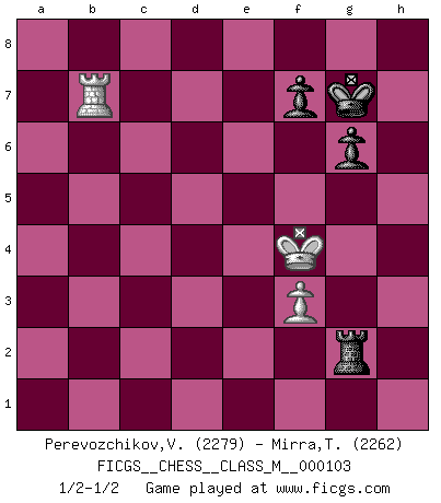 Last move : 1/2-1/2 2022 July 27 0:33:30 [Event "FICGS__CHESS__CLASS_M__000103"] [Site "FICGS"] [Date "2022.07.04"] [Round "1"] [White "Perevozchikov,Vjacheslav"] [Black "Mirra,Theodore"] [Result "1/2-1/2"] [WhiteElo "2279"] [BlackElo "2262"] 1.Nf3 d5 2.g3 Nf6 3.Bg2 c5 4.O-O e6 5.b3 Nc6 6.Bb2 Be7 7.d4 O-O 8.dxc5 Bxc5 9.c4 dxc4 10.Qc2 Qe7 11.Qxc4 e5 12.Nbd2 Be6 13.Qh4 Rad8 14.Nc4 Nd4 15.Nfxe5 Nxe2+ 16.Kh1 Bd4 17.Ba3 Bc5 18.Bb2 Bd4 19.Bxd4 Nxd4 20.Rad1 Nf5 21.Qf4 Nd5 22.Qc1 Qc7 23.Rfe1 b5 24.Nd2 Qxc1 25.Rxc1 Nb4 26.Ndf3 Nxa2 27.Rc5 a6 28.Nc6 Rd5 29.Rc2 Rd6 30.Rb1 a5 31.Rxa2 Rxc6 32.Rxa5 Rc3 33.h3 Rb8 34.g4 Bd5 35.Rd1 Bxf3 36.Bxf3 Rxf3 37.Rxb5 Rc8 38.Rxf5 Rxh3+ 39.Kg2 Rxb3 40.Rd7 Rf8 41.Ra5 h6 42.R5a7 Rb5 43.Kg3 h5 44.gxh5 Rxh5 45.Kg4 g6 46.f3 Kg7 47.Rdb7 Rf5 48.Ra4 Rh8 49.Rf4 Rxf4+ 50.Kxf4 Rh1 51.Kg4 Rg1+ 52.Kf4 Rg2 53.Ke5 Re2+ 54.Kf4 Rg2 55.Ke5 Re2+ 56.Kf4 Rg2 1/2-1/2 Reti : King's Indian attack (Barcza system) Kingside Castling by player White (move 4) Kingside Castling by player Black (move 7) 10 pieces endgame at move 44 : White KRRPP , Black KRRPP WHITE : King + 2 Rooks 2 Pawns BLACK : King + 2 Rooks 2 Pawns 9 pieces endgame at move 44 : White KRRP , Black KRRPP WHITE : King + 2 Rooks 1 Pawn BLACK : King + 2 Rooks 2 Pawns 8 pieces endgame at move 49 : White KRP , Black KRRPP WHITE : King + 1 Rook 1 Pawn BLACK : King + 2 Rooks 2 Pawns 7 pieces endgame at move 50 : White KRP , Black KRPP WHITE : King + 1 Rook 1 Pawn BLACK : King + 1 Rook 2 Pawns This chess game ended in a draw. Follow this game move after move (download)The tactician must know what to do whenever something needs doing; the strategist must know what to do when nothing needs doing. (Savielly Tartakover) Fischer machte Schach einfach zu einer aufregenden Sache, wann immer er sich ans Brett setzte. (Raymond Keene) Todos los Maestros de Ajedrez fueron un día unos principiantes. (Chernev) Ce n'est pas pour s'amuser qu'il joue aux échecs : il célèbre un culte. (Vladimir Nabokov) The Movers & Shakers of this world are those who play chess in the mornings and go to the disco in the evenings. (Dinesh De Silva)